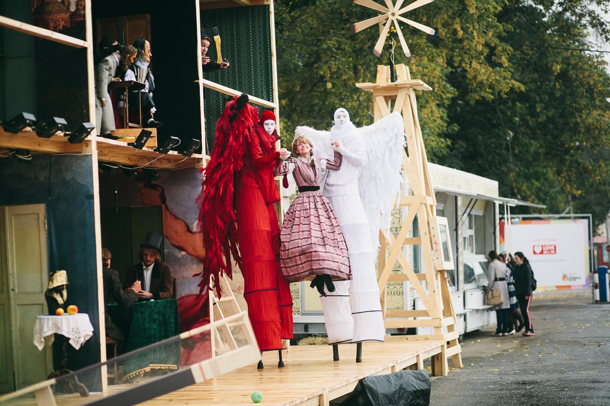 Белочки встретились нам только в Нескучном Саду. А так прошли еще Парк Горького и Воробьевы, никого не встретили. Да холодно было. В музеи не попали, но тоже присматриваюсь к ним ) Зато были в Коломне, попали как раз на праздник Антоновских яблок. Москвичи, как вам повезло, что у вас в часовой доступности столько интересного) Сама Коломна- по ней часов 5 можно гулять, выписывая круголя по Кремлю, по улицам ( даже колонки сохранились!), между симпатичными домами. Куда не наступи- везде исторический камень. А вот фото из инета -праздник яблока: Эти ребята на ходулях вблизи пугающе выглядят, мозг их не воспринимает и боится :-)