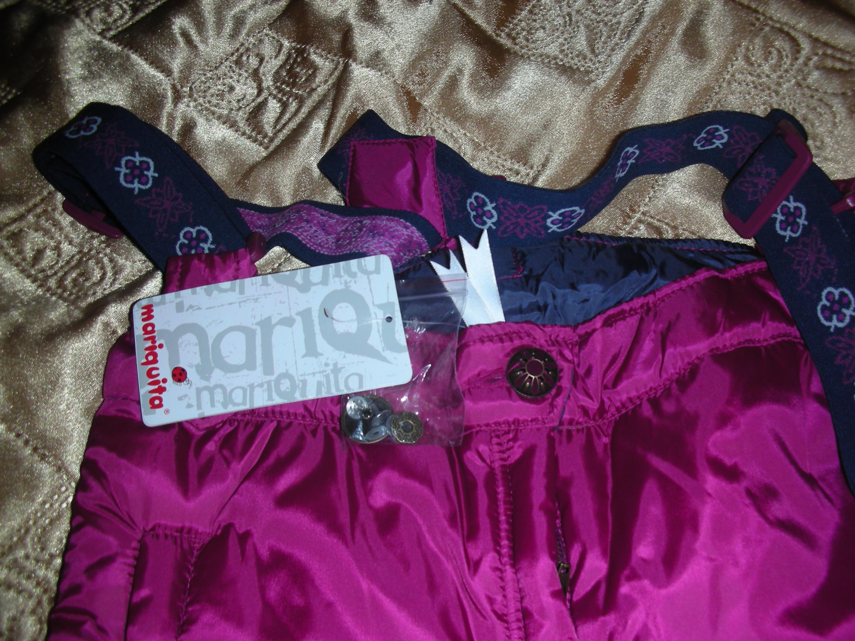 Продаю утеплённые брюки Mariquita для девочки ,абсолютно новые,с бирками.Размер 122(6-8 лет).Материал 100%полиэстр,подкладка и набивка 100%полиэстр.Снизу манжеты на резинке и с "липучкой".Спереди ширинка на молнии.Сзади два кармана.Мягкие регулируемые лямки можно отстегнуть.1000р.