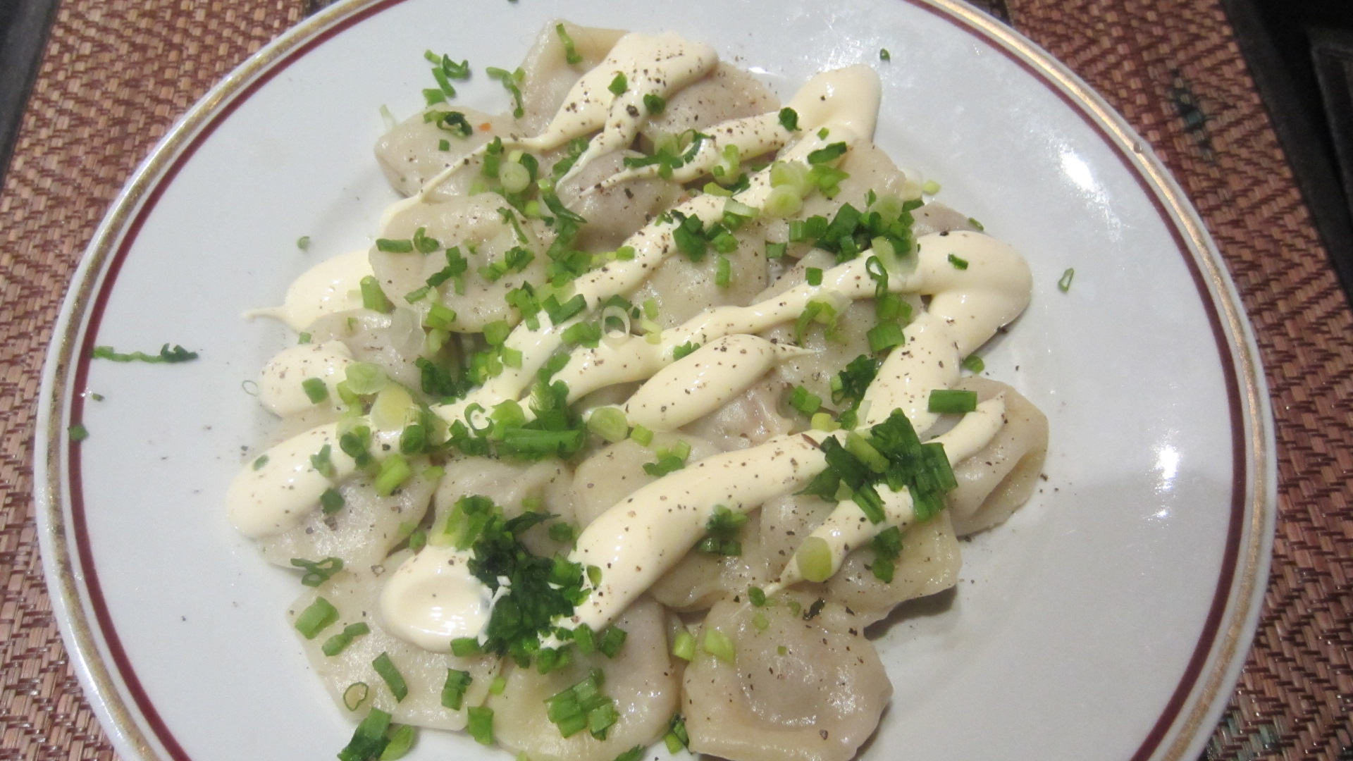 Вкусно. очень. Тесто нежнейшее. но в тоже время ни один не развалился. не раскрылся. Фарш и обилие в нем жареного лука сделали пельмени не похожими ни на что ранее пробованное. аромат лука. нежность мяса, но...лук дал сладость не совсем уместную в пельменях, но все равно вкусно. Один минус. я обычно ем 10-13 штук и наедаюсь. а эти проскочили и было мало, догналась сметаной с бородинским хлебом Фотки процесса и результата. Мужу со сметаной. мне с майонезом