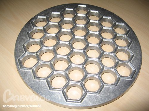 У меня круглая железная. Ранее вон выкладывала фото с пельменями. Сразу 37 штук получается. Только я первые пельмени накосячила, не посыпала пельменницу мукой и пельмешки пришлось выдавливать. Они не расклеились, но внешний вид помятый. А последняя партия уже вся ровненькая.