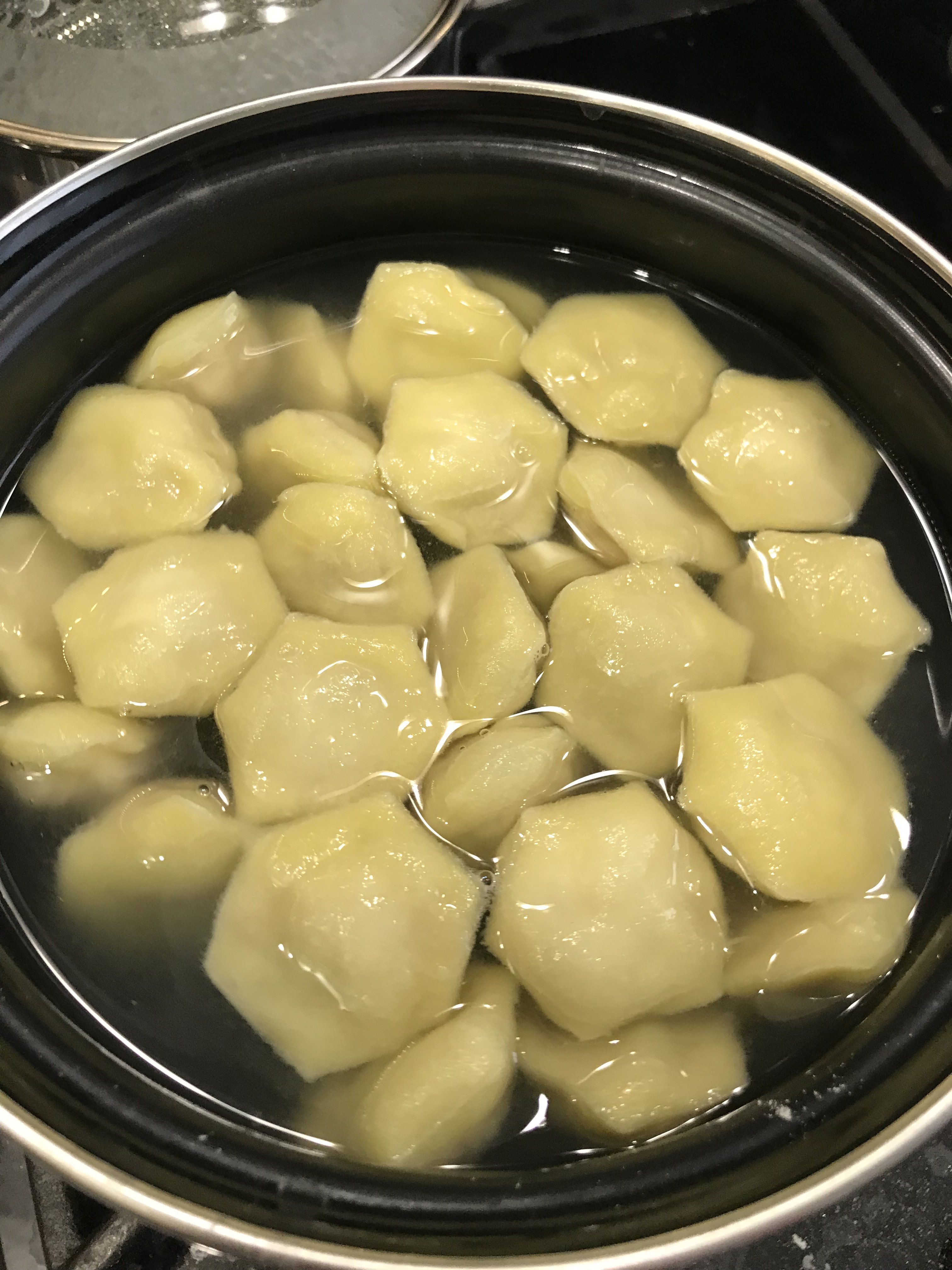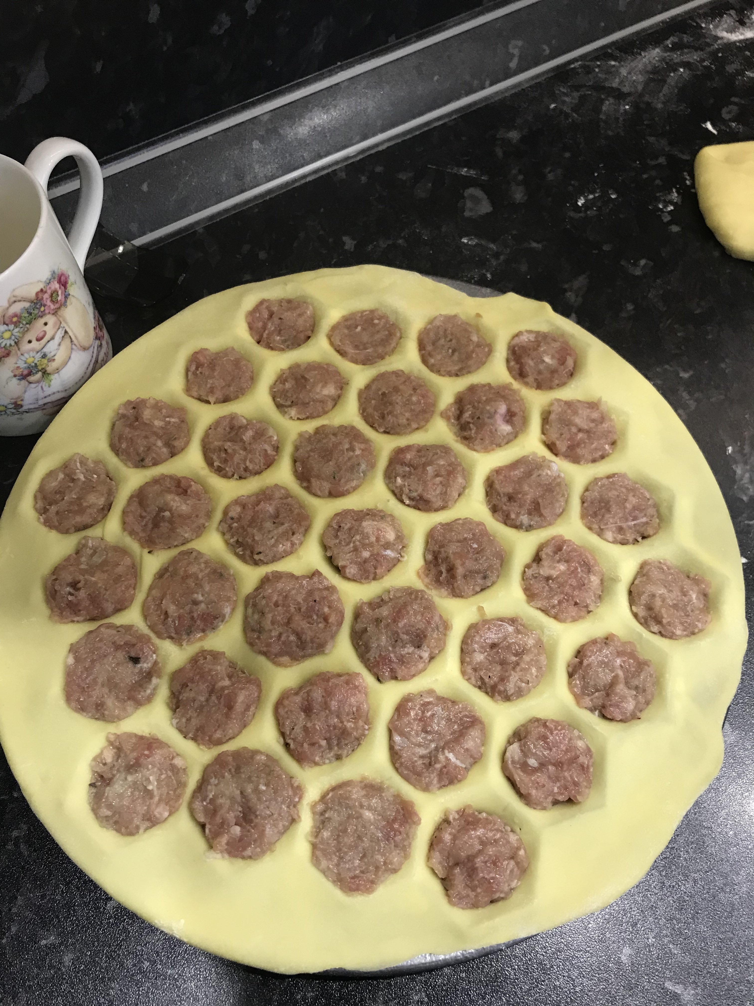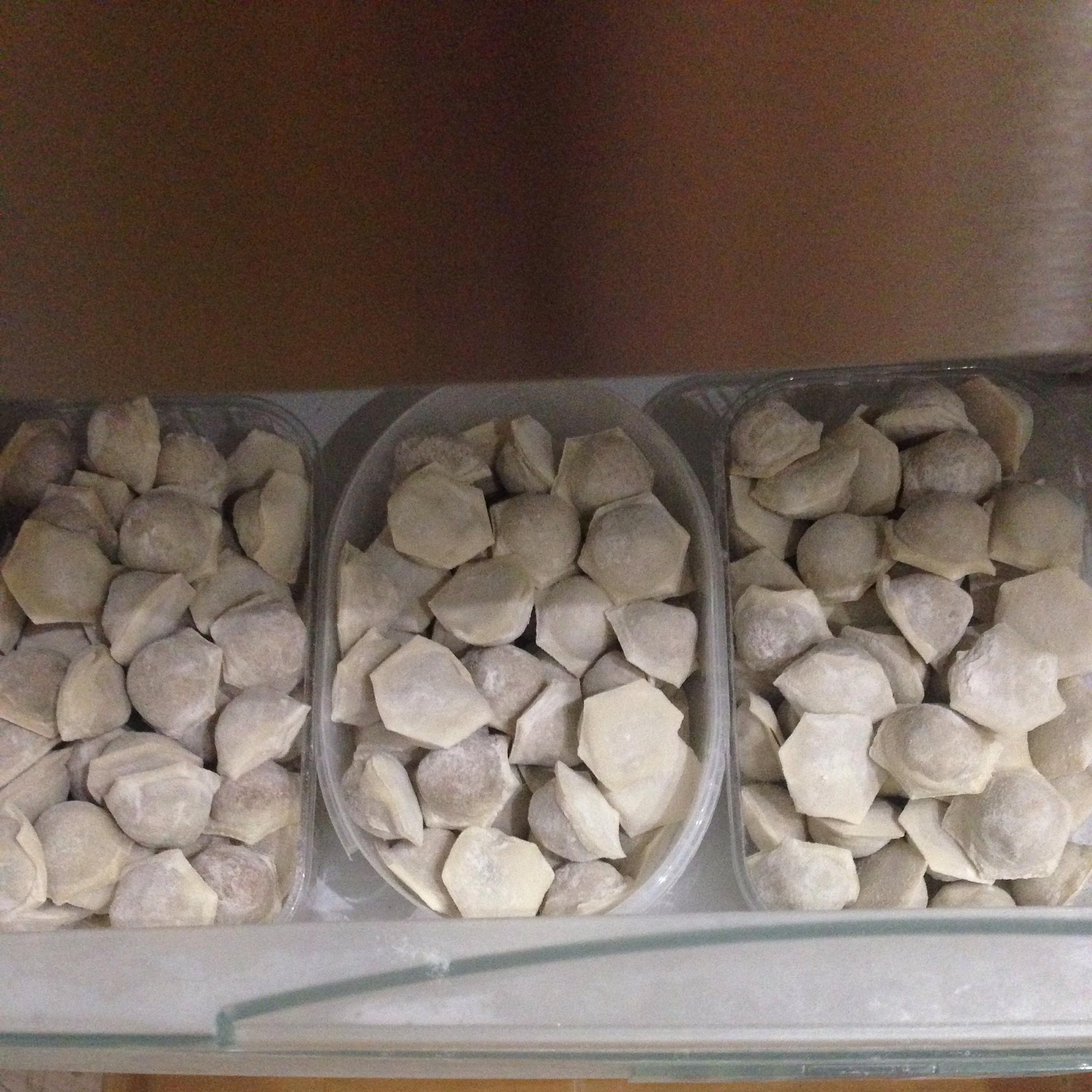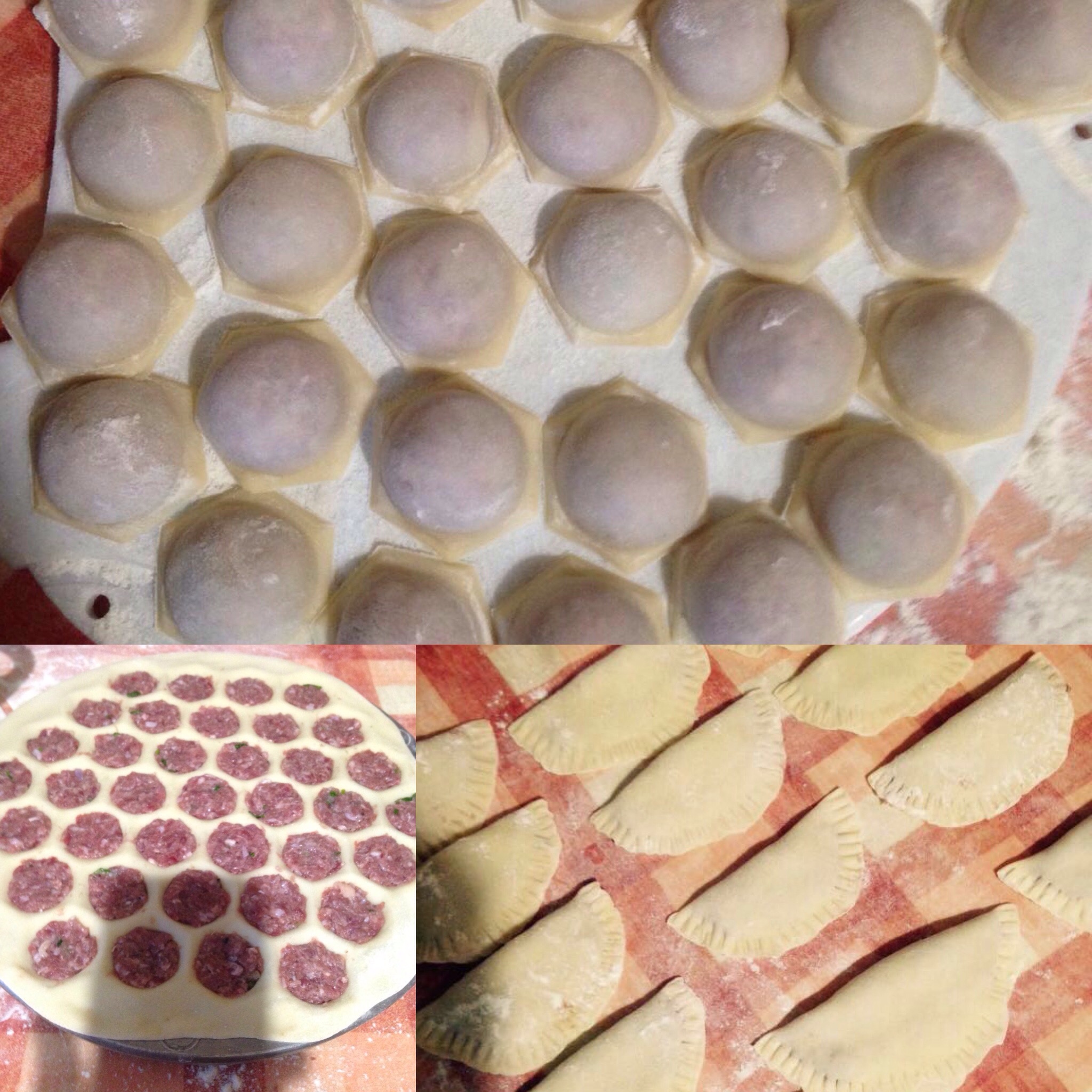 С подружкой сегодня пельмени лепили. И чебуреки. Тесто на молоке. Начинка: говяжий фарш, чуть куриного, соль, перец черный молотый, лук репчатый, кинза. Делали на форме, получилось 184шт пельменей. С обрезков теста слепили чебуреки, 14шт получилось. Вкусно