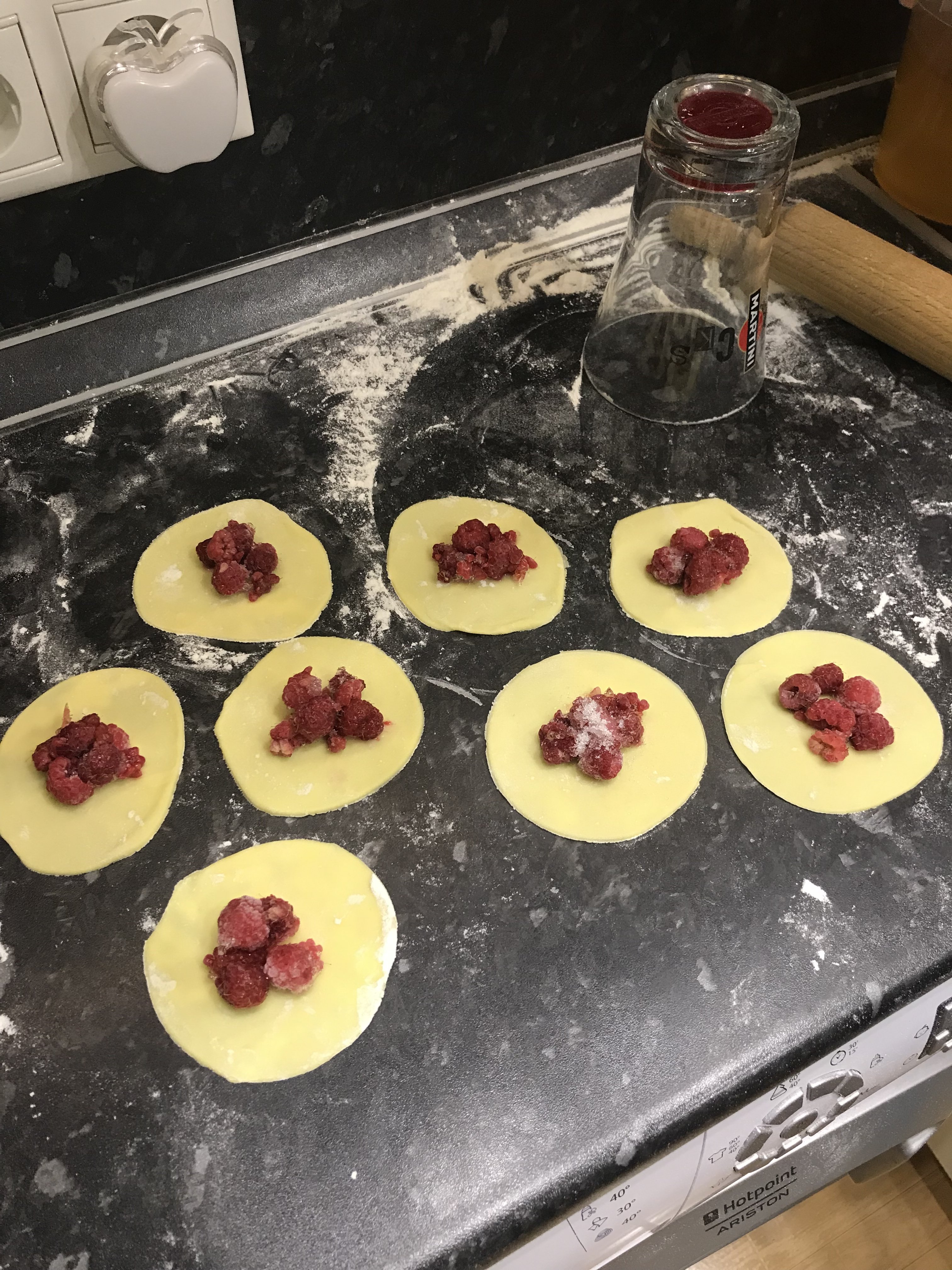 Пельмени окт.2019 Тесто Мука - 500 гр, у меня макфа. Яйцо - 1 шт, у меня домашнее Растительное масло - 1 ст.л., оливковое брала Соль - 1 ч.л. Молоко - 250 мл. Муку просеиваю в миску, добавляю яйцо, перемешиваю, добавляю масло и соль, перемешиваю, вливаю молоко и замешиваю тесто. Выкладываю тесто на стол и хорошо его вымешиваю, до однородности и мягкости. Иногда добавляю ещё молоко прям по 5-10 мл при необходимости. Кладу тесто в пакет и в миску, оставляю на столе в покое минут на 40. Начинка Свинина - 500 гр Говядина/телятина - 500 гр Лук репчатый - 1 шт Соль, чёрный молотый перец, базилик сушенный - по вкусу Мясо, лук перекручиваю, добавляю по вкусу специи, хорошо перемешиваю. Леплю в форме, тк в одного руками долго и нудно. Но ручная лепка, всё же вкуснее)) Я выросла на пельменях чисто из свинины, сейчас мне так немного жирно и я делаю с добавлением говядины/телятины. Сегодня у меня пельмени из мяса индейки. Сделала 3 формы, это 111шт. При подаче люблю добавить сливочное масло и конечно сметану) Иногда хочется в уксус (разбавленный с водой) макать, это уже тогда без масла и сметаны. Из этого же теста сделала немного вареников с малиной. А из остатков теста всегда шинкую лапшу. Лапша тонкая) В идеале варим бульон из домашней курицы, заправляем лапшой домашней и сразу едим.