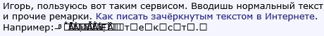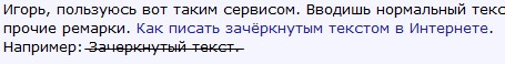 Игорь, пользуюсь вот таким сервисом. Вводишь нормальный текст, на выходе получаешь зачёркнутый. Но весьма криво выходит зачастую. Но лучше, чем всякие скобки, кавычки и прочие ремарки. Как писать зачёркнутым текстом в Интернете. Например: ̶З̶а̶ч̶е̶р̶к̶н̶у̶т̶ы̶й̶ ̶т̶е̶к̶с̶т̶.̶