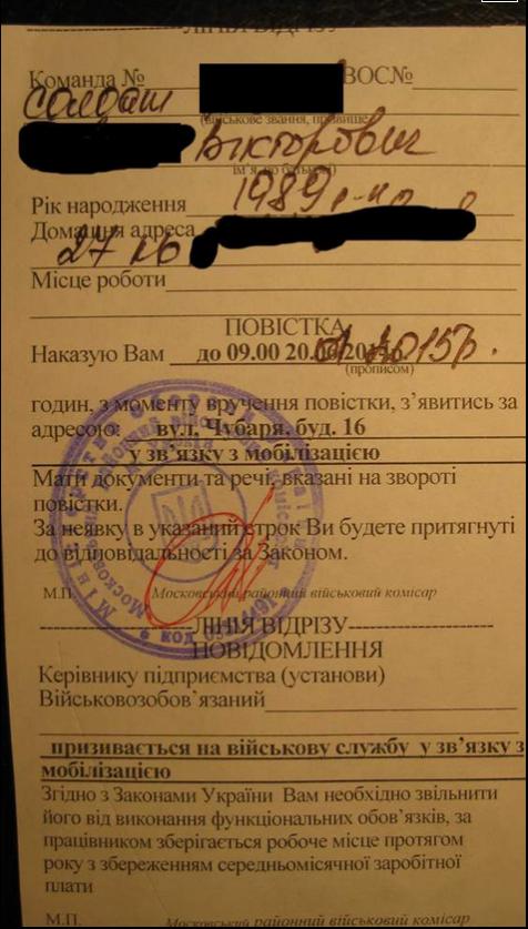 За неявку в военкомат по повестке при полной или частичной мобилизации уклонисту грозит административная ответственности в виде штрафа от 85 до 119 грн., за нарушение законодательства о мобилизации предусмотрена административная ответственность в виде штрафа от 17 до 51 грн., за умышленное уничтожение приписного свидетельства или военного билета - штраф в размере от 17 до 51 грн. За уклонение от призыва по мобилизации в ст. 336 Уголовного кодекса Украины прописана ответственность в виде лишения свободы на срок от двух до пяти лет. Так выглядит "черная метка ."