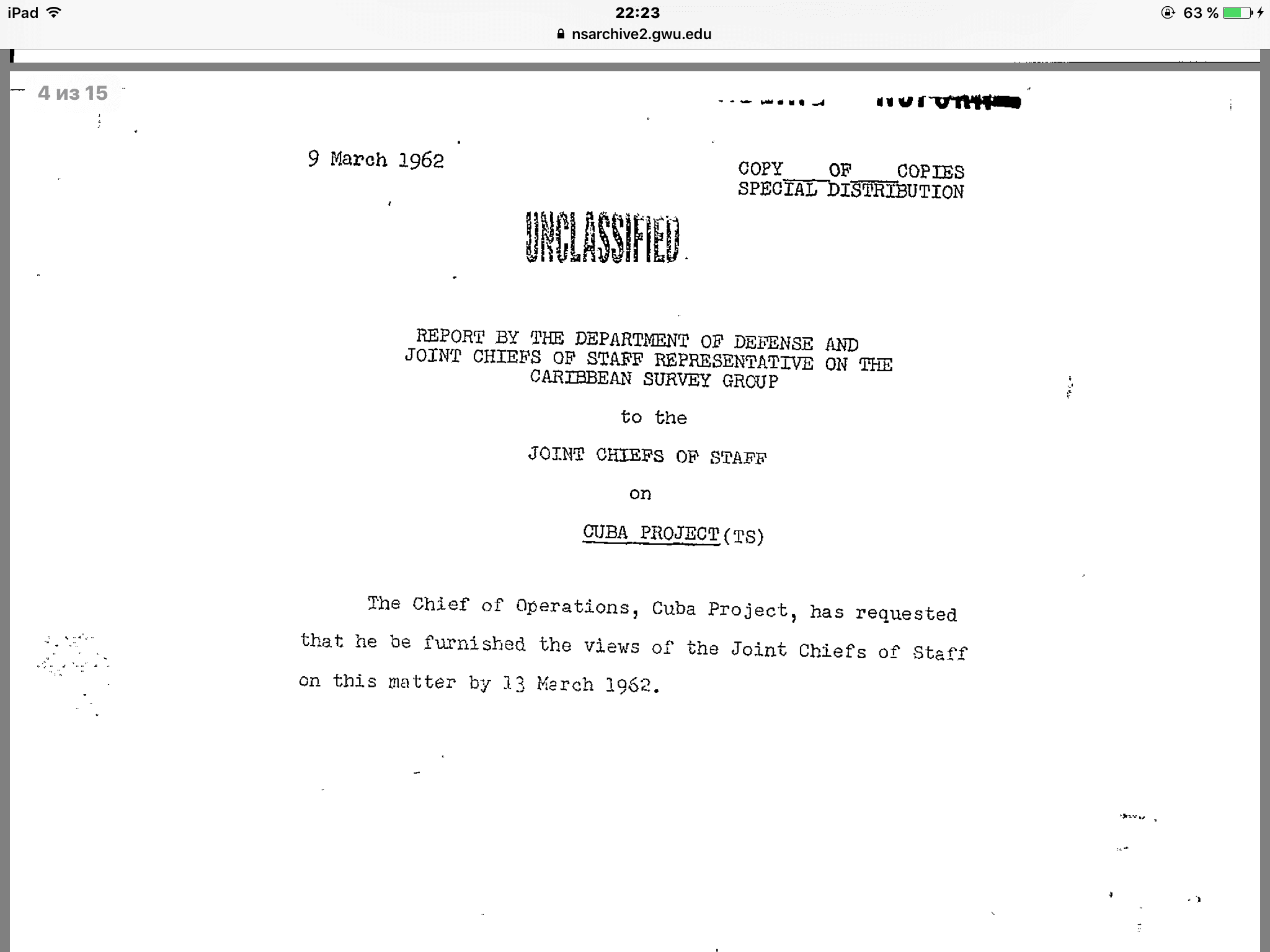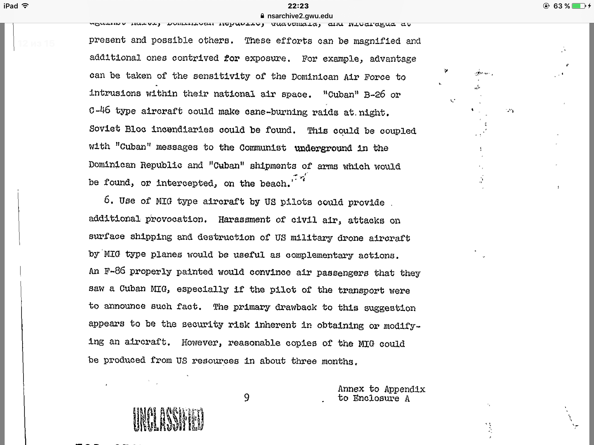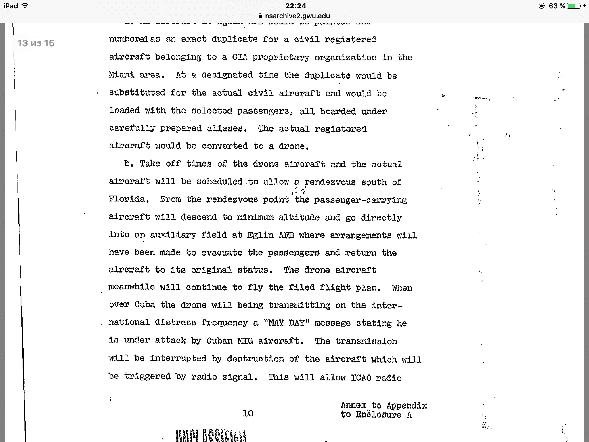 Тут вот интересный документ отыскался между делом. https://nsarchive2.gwu.edu//news/20010430/doc1.pdf Рассекреченый, прямо на сайте Университета Джорджа Вашингтона, того самого, что в округе Колумбия, город Вашингтон. Некий меморандум Комитета начальников штабов США. Документ небольшой, всего 15 страниц в пдф. Там много всяких предложений по насущным мероприятиям, но цитатку я приведу, касающуюся как раз гражданских самолетов. (Ну и еще, что там кривой планшетный копипаст накопипастит) Источник и полный текст Иран и обоснование военной интервенции на Кубу (balda74) .