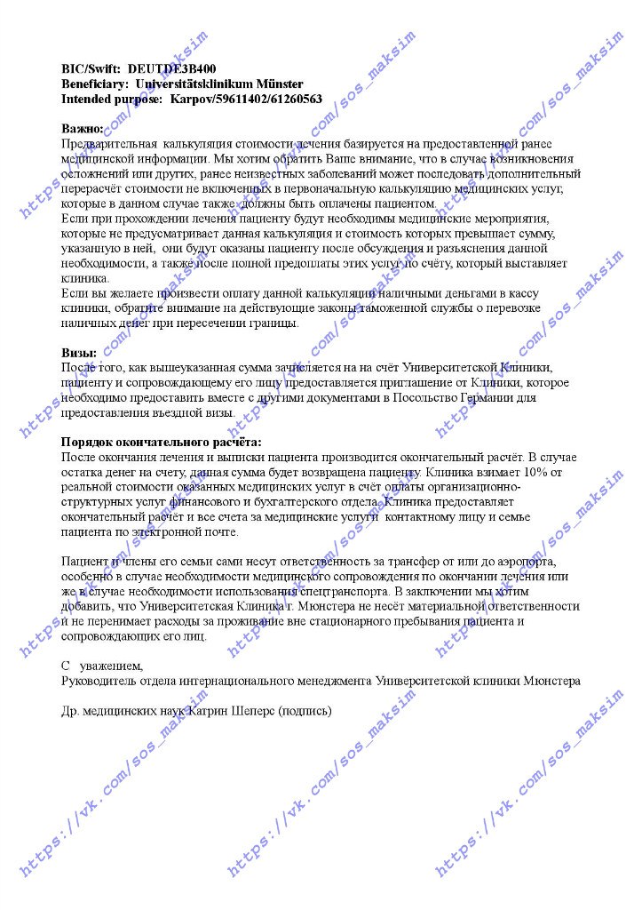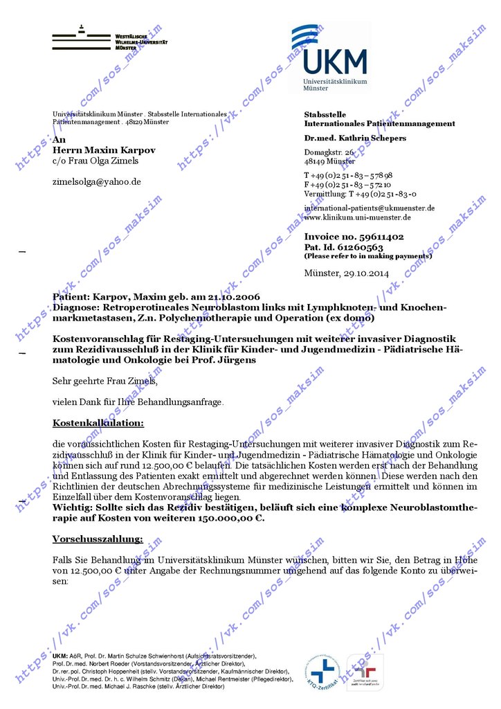 шутник, Вы простите, но я немного уточню((( Из приложенных документов, к сожалению, не следует, что в Клинике Мюнстера Это счет на предварительное обследование с целью рассмотреть возможность дальнейшего лечения. По результатам обследования лечение могут и признать бесперспективным(((. Но диагностика, конечно, необходима! И можно вопрос: а запросы в университетскую клинику Грайфсвальда и лондонскую Харли-Стрит направляли? Они что-то ответили? Они в авангарде лечения нейробластомы, имеют неплохо зарекомендовавшие себя экспериментальные противорецидивные протоколы, и честно не берутся за безнадежные случаи (из-за чего с ними Подари жизнь сотрудничает)