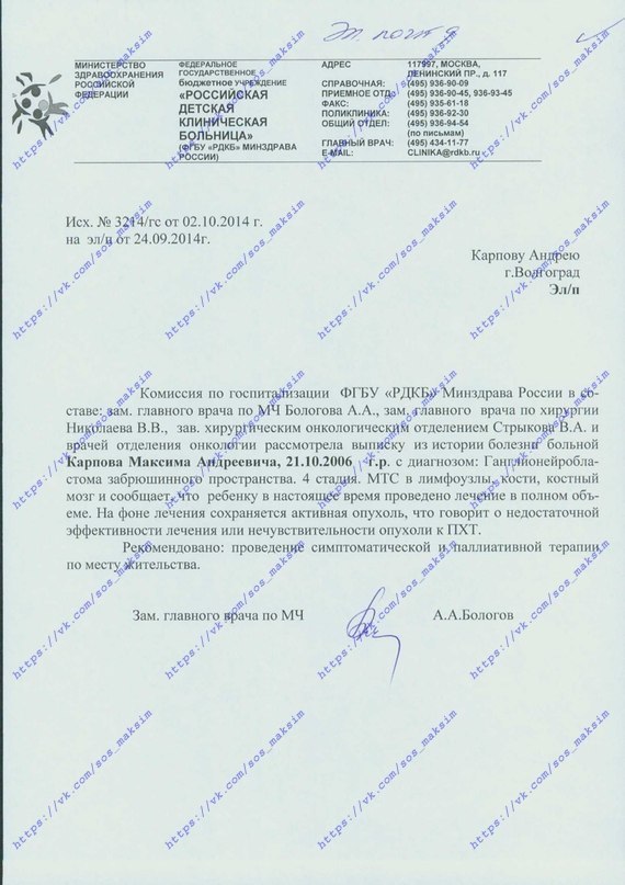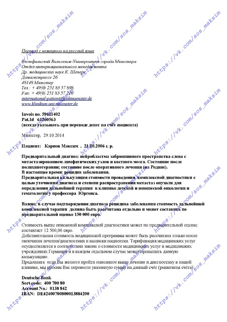 В теме списано с форума http://www.volgo-mama.ru/forum/index.php?showtopic=206753&st=0&gopid=4256461&#entry4256461, теперь своими словами мальчик ходил с моим племянником в одну группу, дети готовились к школе, Максим заболел и вот его родители второй год пытаются вылечить, изучив само заболевания, я как обыватель могу сказать да, заболевание очень серьезное, на обследование необходимо собрать 12500 евро, курс зараза как назло растет, и говорить об окончательной цифре пока рано, собрали около половины необходимой суммы, если говорить про заболевание и шансы, то мне кажется шанс есть всегда, надо стараться, самое простое это сдаться, изучив само заболевание прикинула 10-20% излечиваются, да это мало, хотя с какой стороны посмотреть,для такого заболевания мне кажется отлично, 4 стадия рака звучит страшно, и даже как приговор, но гляньте на Майкла Дугласа, у нас бы его бы давно закопали, у меня был один знакомый с таким заболеванием, уже который год на кладбище Дрозофила, конечно могут отказать, наши уже сказали, даже не знаю не ужели мы не можем построить свои центры, чтоб не кормить иностранцев, аж обидно, я не говорю что нас должны здесь бесплатно лечить, берите деньги, и не придется тяжелобольного доставлять самолетом, оплачивать услуги переводчикам, визы и тд... ---------- Сообщение добавлено 01.12.2014 19:21 ---------- У меня просьба отписывайтесь пожалуйста при перечислении денег ---------- Сообщение добавлено 01.12.2014 19:26 ---------- Я честно говоря даже не знаю какие клиники существуют, я передам обязательно названия клиник пусть посмотрят