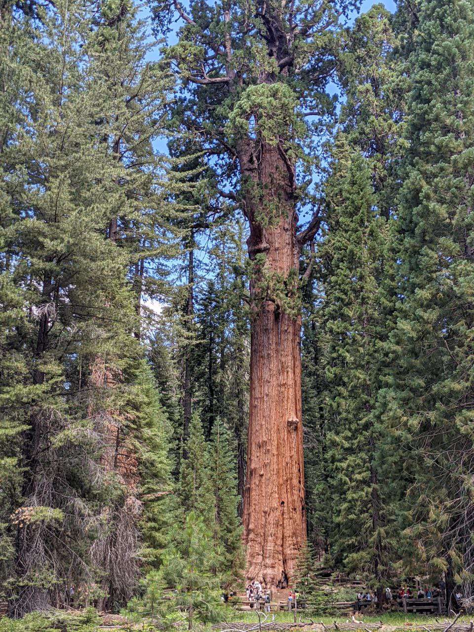 Пара фоток с прогулки по калифорнийскому лесу. На первом фото самое большое дерево и одновременно самый большой организм на земле - Генерал Шерман. 2300 - 2700 лет, диаметр у основания 13 метров, окружность 31.5 метров, около 2000 тонн. На втором фото не такое большое, но тоже внушительных размеров гигантская секвойя и я там где-то внизу снимка с детьми в виде нескольких пикселей.
