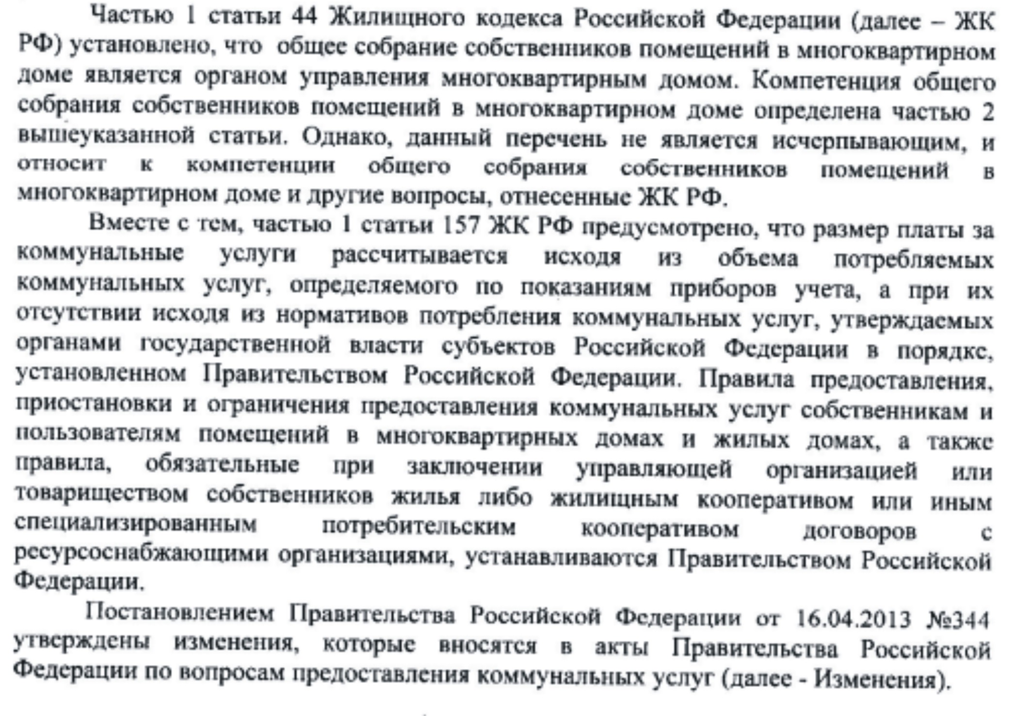 Мое обращение: Абзацем 2 п.44 ПП РФ 354 «О предоставлении коммунальных услуг гражданам…» собственникам якобы предоставлено право на принятие решения общим собранием о распределении сверхнормативного потребления ресурсов между собственниками пропорционально размеру общей площади каждого жилого и нежилого помещения: – распределяемый между потребителями объем коммунальной услуги, предоставленной на общедомовые нужды за расчетный период, не может превышать объема коммунальной услуги, рассчитанного исходя из нормативов потребления коммунальной услуги, предоставленной на общедомовые нужды, за исключением случаев, когда общим собранием собственников помещений в многоквартирном доме, проведенным в установленном порядке, принято решение о распределении объема коммунальной услуги в размере превышения объема коммунальной услуги, предоставленной на общедомовые нужды, определенного исходя из показаний коллективного (общедомового) прибора учета, над объемом, рассчитанным исходя из нормативов потребления коммунальной услуги, предоставленной на общедомовые нужды, между всеми жилыми и нежилыми помещениями пропорционально размеру общей площади каждого жилого и нежилого помещения. Между тем, пунктом 2 ст.44 ЖК РФ к компетенции общего собрания такой вопрос не отнесен и он не может быть включен в повестку дня. А принятие решения по вопросам, не отнесенным к компетенции общего собрания, ничтожно в силу закона (ст.181.5 ГК РФ). Таким образом, предоставленное абзацем 2 п.44 ПП РФ 354 право собственников вступает в противоречие с п.2 ст.44 ЖК РФ в виду отсутствия возможности реализовать это право на общем собрании, потому как включение в повестку дня данного вопроса неправомерно. Согласно п.8 ст.5 ЖК РФ в случае несоответствия норм жилищного законодательства, содержащихся в федеральных законах и иных нормативных правовых актах Российской Федерации, законах и иных нормативных правовых актах субъектов Российской Федерации, нормативных правовых актах органов местного самоуправления, положениям настоящего Кодекса применяются положения настоящего Кодекса. Таким образом, можно сделать вывод, что в силу преимущественного правоприменения положений ЖК РФ, собственники, несмотря на предоставленное абзацем 2 п.44 ПП РФ 354 право принятия решения о распределении на собственников сверхнормативного потребления пропорционально размеру общей площади каждого жилого и нежилого помещения, все также не вправе принимать подобные решения в виду не отнесения данного вопроса к компетенции общего собрания. А если такие решения все же приняты, то они ничтожны. Прошу Вас изложить позицию Госжилнадзора по данному вопросу и особенно о юридической силе решения общего собрания по вопросу распределении на собственников сверхнормативного потребления пропорционально размеру общей площади каждого жилого и нежилого помещения (если такое решение все-таки принято). Ответ ИГЖН прилагаю. В общем, как обычно в РФ законодательстве - выше норматива нельзя одн-ки ставить, но если жителям очень хочется, то можно (они ж - собственники). Осталось УКашкам "сформировать" протоколы о том, что жителям очень хотелось, а жители потом пусть в судах пеной исходят о том, что они подобных решений не принимали.