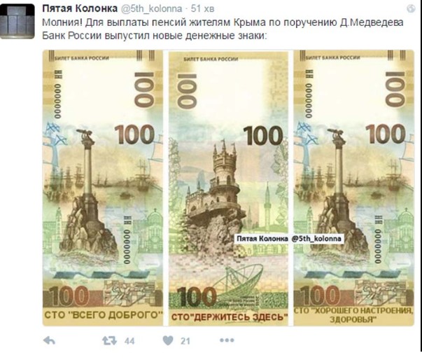 Читайте внимательнее. Речь идёт о . Из них 29 вспомнили Косово и решили, что Крым имел право поступить аналогично. И я нигде не говорила о том, что завтра начнут снимать санкции. По мне, так они скорее полезны нам, чем вредны. Но вопросы пользы для России чего-либо не с Вами обсуждать. С Вами - только вред ---------- Сообщение добавлено 18.05.2016 22:34 ---------- Флавиус, ещё раз