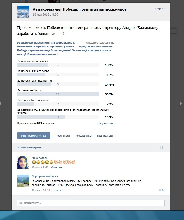 Слетал в праздники в Москву. В принципе, всё прошло нормально, но тенденции настораживают. Цены на билеты неуклонно ползут вверх и уже приблизились к обычным, ни о каких 999руб. уже и речи нет (чего тогда кричать, что "мы лоукостер"?). С 3 мая без предупреждения уменьшили суммарный габарит ручной клади в салон. Меня это не коснулось, т.к. летел почти пустой, но народ в интернетах бурно обсуждал. В группе Вконтакте даже голосование запилили "на чём ещё рубить бабло Калмыкову?", в комментах жесть Кстати, и отношение к персоналу свинское. Разговорился со стюардессой: режим работы адский- 6/1 при рабочем дне до 12 часов! Текучка очень большая, многие не выдерживают. Сейчас смотрю цены на август и охреневаю- самые дешёвые билеты от 4499, хотя даже у Аэрофлота на эти же числа цена от 3000 руб. Вот это как? У лоукостера(!!!) цена в полтора раза выше, чем у обычной АК. В общем, всё как всегда. Скатываются в непомерное жлобство и быдлячество. Хапать ртом и жопой, здесь и сейчас. Бизнес по-русски. Не удивлюсь, если закончат так же как Авианова и Добролёт. Печально всё.