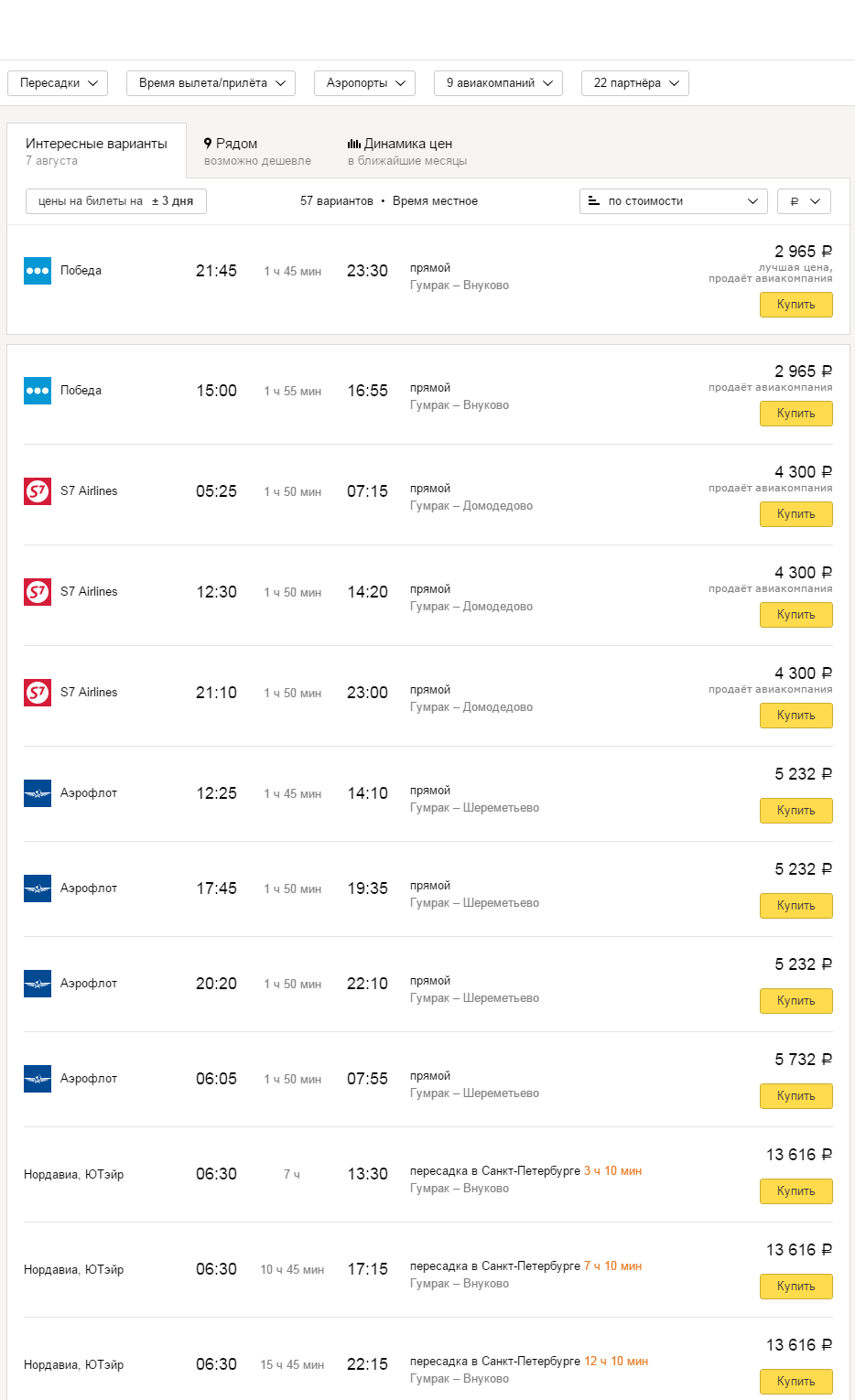 Arturvn, 7 раз слетали и самый дорогой билет 2900? И лишь один раз Победой? Вы точно не врёте или что-то не договариваете? Это со сборами такая цена? Я сейчас ткнул в случайные даты на сетнябрь. Самые дешёвые билеты туда-обратно дороже 7 тысяч получаются.