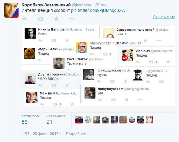 Интересно, кому это было нужно? Кому это было выгодно? Провокация накануне акций протеста первого марта и на фоне событий вна Украине? ---------- Сообщение добавлено 28.02.2015 01:05 ---------- Три темы об одном и том же одновременно