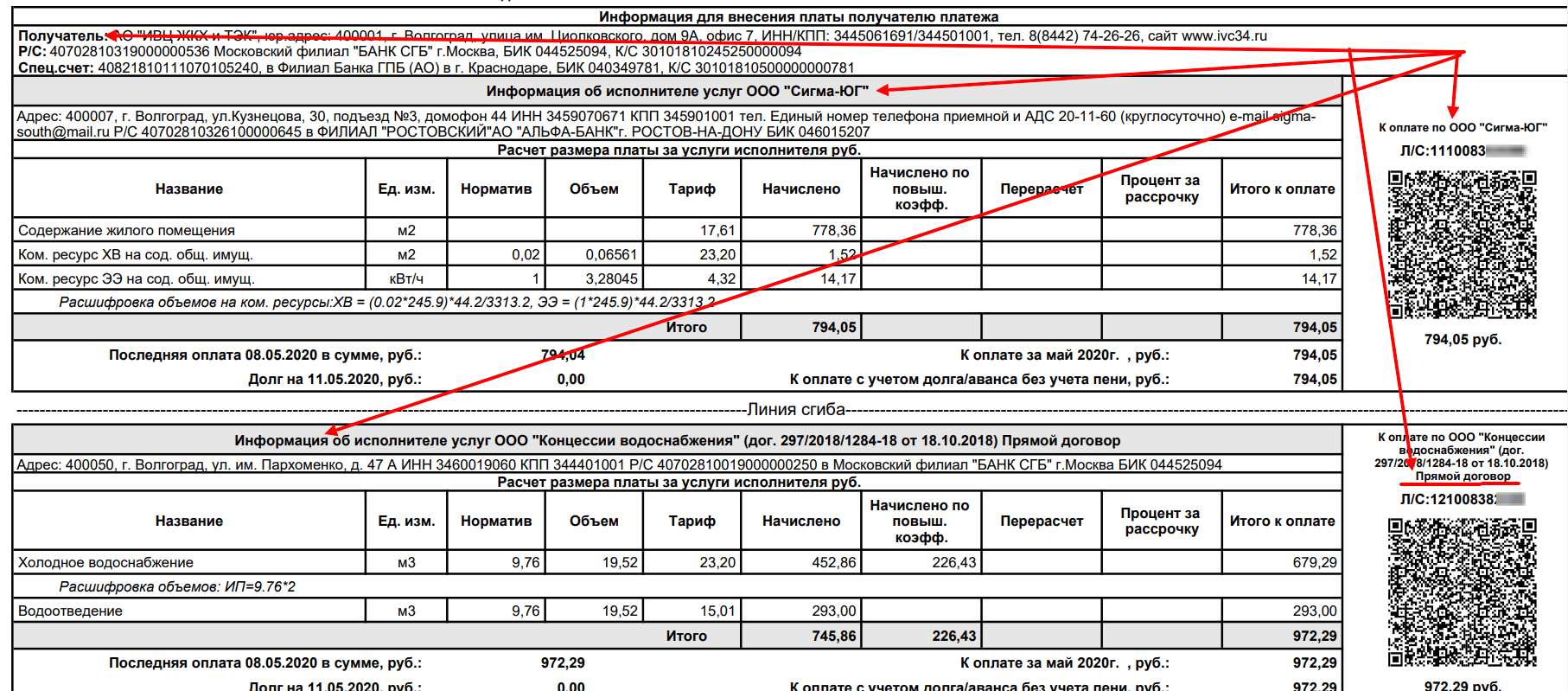 так в личном кабинете одна сумма к оплате, общая, никаких разделений нет. У лицевых счетов только разные первый цифры, остальные совпадают с номером общего счета. Так не первый месяц, всё доходит, долга нет