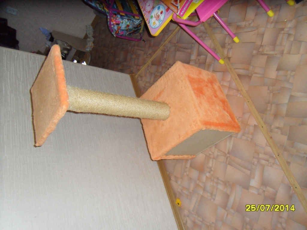 Кошка не поладила с ребенком и ушла в добрые руки, добрые руки дом не захотели, поэтому продается за себестоимость материалов. Кошка дом очень любила, точила когти только на нем, зимой спала внутри, летом на верхней полке. Корпус сделан из толстого ДСП это придает дому устойчивость, кошка его перевернуть или сдвинуть не в силах. Когтеточка из настоящего сизалевого каната он почти в идеальном состоянии. Обивка искусственный мех. внутри обивки нет, просто съемная подушка, зелёная ;-) так захотелось. Высота 110см; Высота когтеточки 68см; Ширина дома 47см; Глубина дома 47см; труба снимается, можно увезти в любой машине. для участников форума 1000р.
