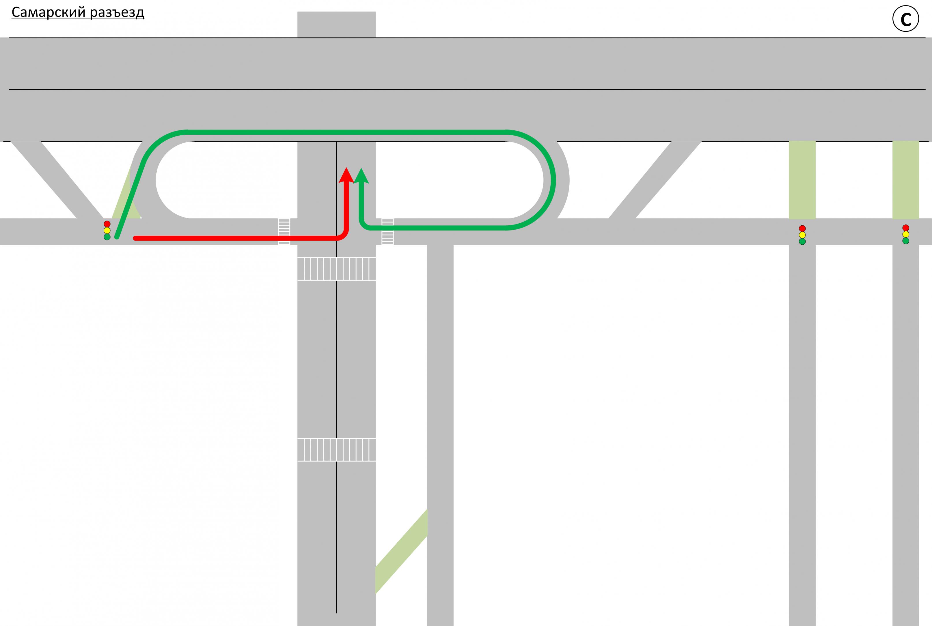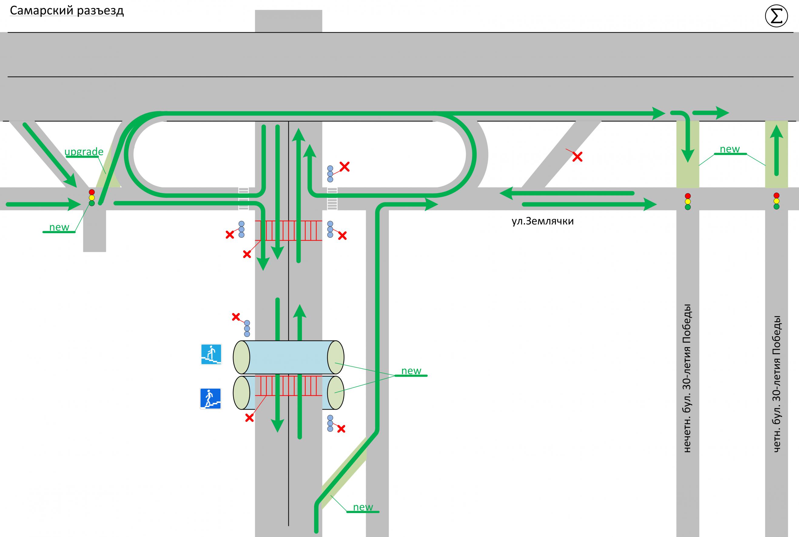 А зачем пешеходный переход и наземный, и подземный нарисован? Одного достаточно, надземный, думаю, проще реализовать. Если с Исторической, в сторону Бульвара ехать, то по предложенной схеме получается надо направо и на 3-ю продольную уходить, а потом с нее на Землячку в районе Бульвара возвращаться? Тяжеловато для понимания будет. Это все хорошо, тут хоть на мосту на самарском асфальт бы полностью заменили...