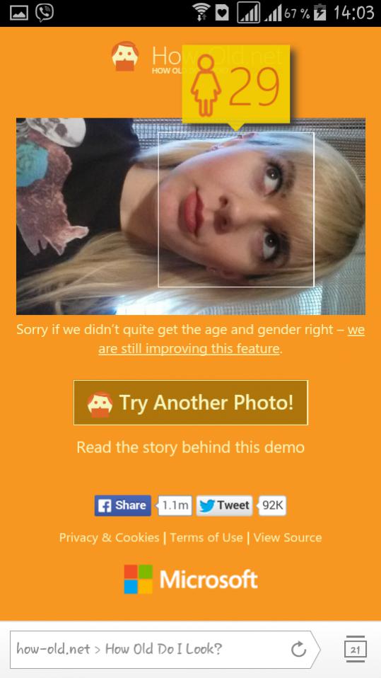 Три фото с разницей в улыбании- 28, 34, 36 лет.. Радует, что не больше..но програмка не серьезная. Для каких целей ее придумали? Распознавать возраст собеседника в сети.. Так если фото отретушировано, прога не угадает.