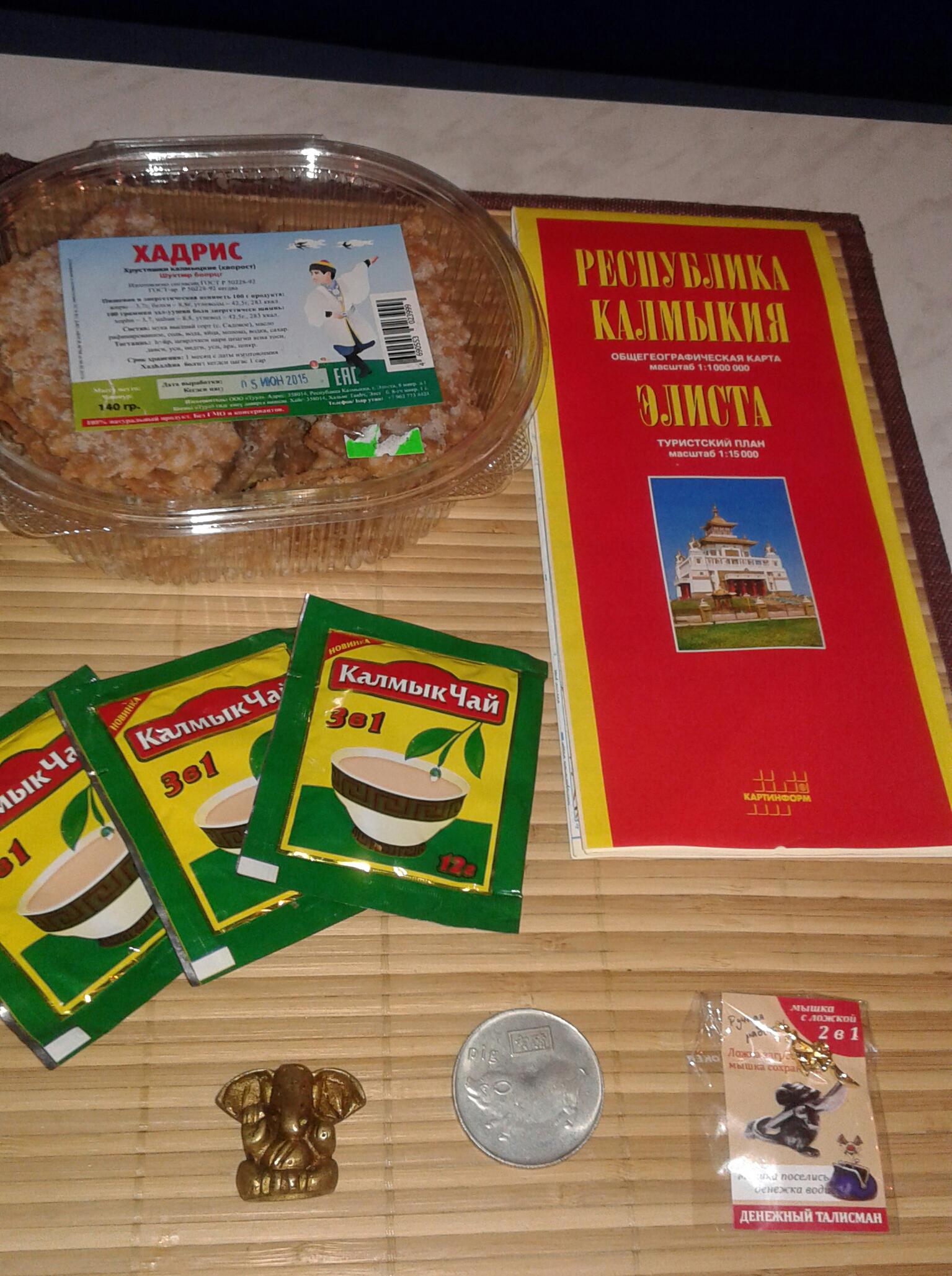 Сувениры: Калмыцкий хворост, чай, карта, статуэтка слоника (как мне сказали,покровитель детей, способствует хорошей учёбе, для дочки), талисман с изображением, мышка с ложкой для обогащения, носить в кошелёчке. В целом, я ооочень довольна)