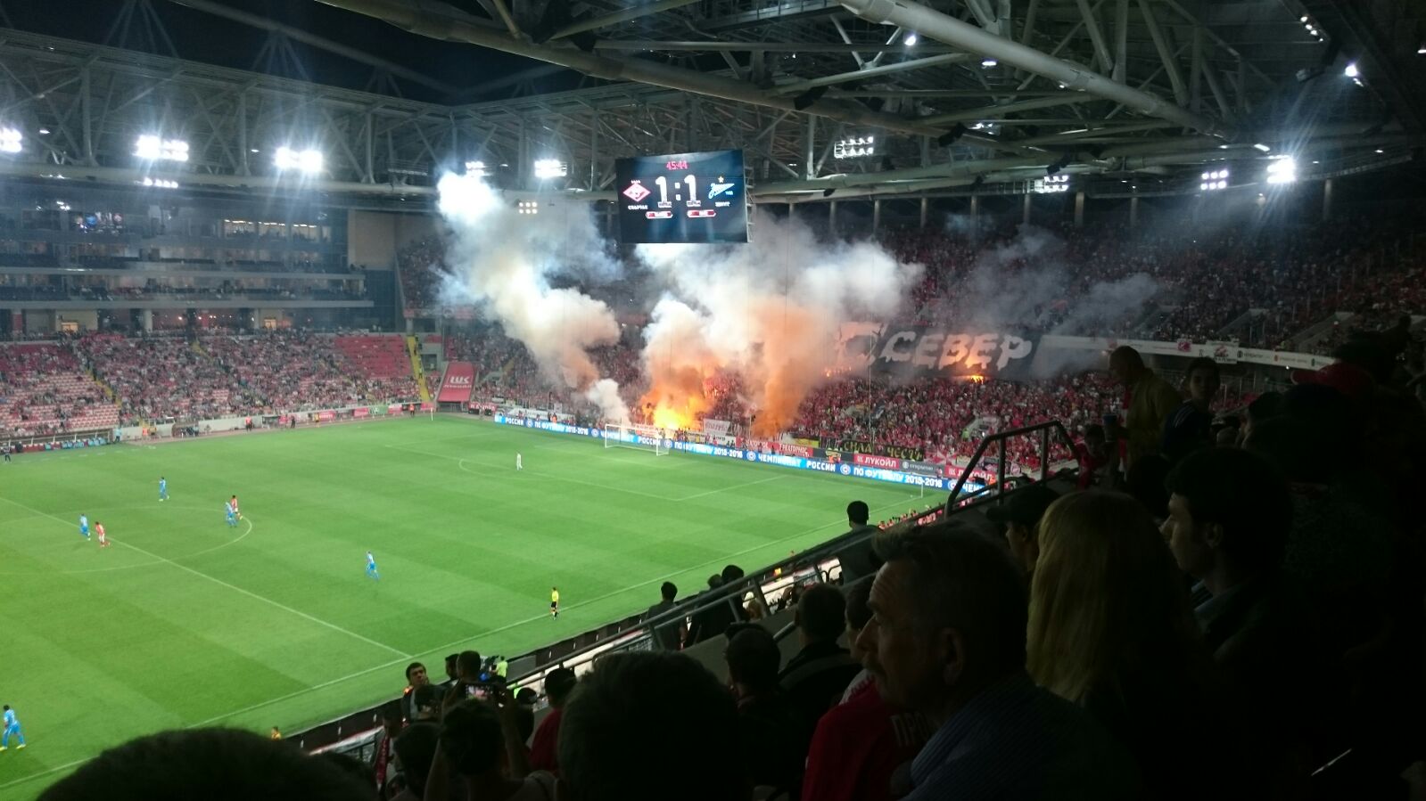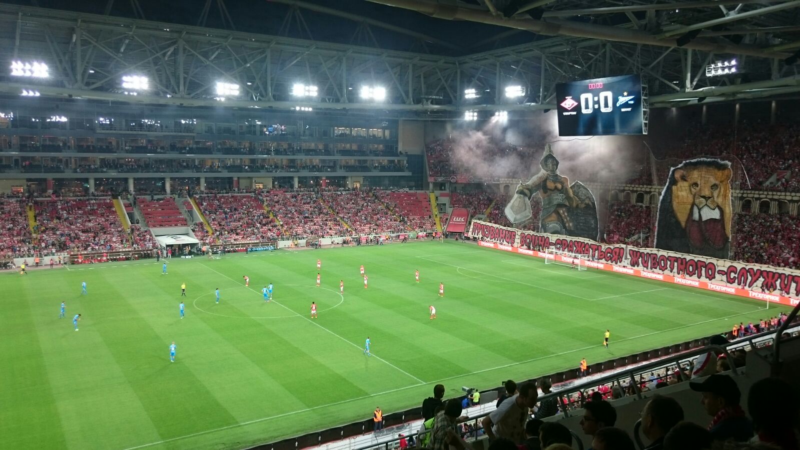 Поделюсь эмоциями от посещения матча Спартак - Зенит, даже если бы матч был унылым, как минимум получаешь эстетическое удовольствие от самого стадиона. На стадионе все очень удобно и продумано, уже начиная от покупки электронного билета на сайте Спартака. Разделение входящих потоков, большое количество рамок и персонала у каждого входа позволяет быстро заполнить стадион без часовых очередей, за 30 мин до начала матча было свободно половина мест, к началу все быстро заполнилось, единственное что пока печалит это сам путь до стадиона - вокруг копают и строят. Внутри стадиона в потрибунных помещениях много общепитовских кафешек и туалетов, алкоголя нет (пиво безалкогольное), расчет только по карте (кеш не принимают). Ощущения что находишься не в России (особенно после похода на топовый матч КХЛ в морально и технически устаревший ледовый дворец ЦСКА). Что говорить - это лучший футбольный стадион России на данный момент! Публика на трибунах разношерстная, мне больше нравится Зенит, оказалось что вокруг есть много людей, которые тоже не торчат от Спартака, было комфортно смотреть весь матч. Фанаты шумели весь матч, питерцы более слаженно и четко их был целый сектор, мясные орали сильнее но особо не разберешь слова кроме "Вперед Спартак" и т.п. Пиротехника дымила несколько раз очень прилично. Сама игра была очень яркой, но было видно, что Спартак индивидуально слабее, а Зенит играет не в оптимальной форме. Дзюбу постоянно освистывали, а он за это реализовал 1 из 2 своих моментов)). У Спартака всю игру делал Промес, тащил, пасовал, обыгрывал, Широкова вообще видно не было (заменили по делу). У Зенита главный мотор был Смольников, постоянно его использовали и он сам брал игру на себя и тащил мяч, Халк и Витсель тоже что-то делали интересное, Данни как-то не впечатлил, а что исполнял Лодыгин это просто кошмар... Голы были очень смотрибельными, что Халк пушечным ударом попал, что Попов исполнил супертрюк (правда там Лодыгин тоже помог). Спартак играл на волевых, Зенит на классе. Шикарный матч и закономерный результат по игре 2:2.