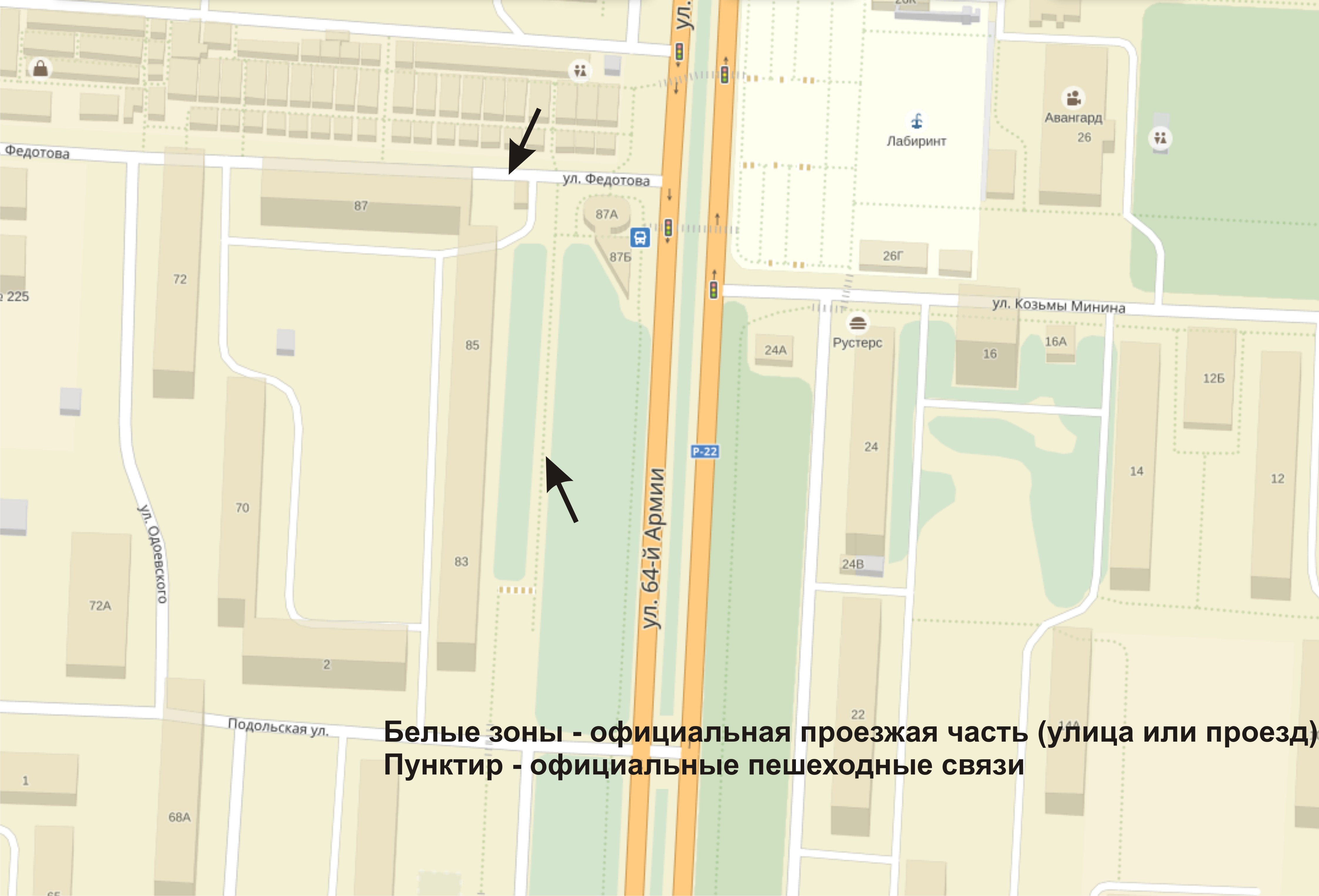 Судя по вашей карте Во двор 83,85 домов 3 проезда, а на деле 1. Проезжая часть на одоевского мимо суда и садика с выходом на базар офиц проезд... вы пробовали там проехать? Официальные пешеходные связи это тропинка 64-й армии))) И судя по карте за к/т авангард можно официально проехать... Не спец по дорогам, но где цветочники торгуют нет ни блока, ни знака, ни бордюра, а значит это дорога. Просто тупик в конце