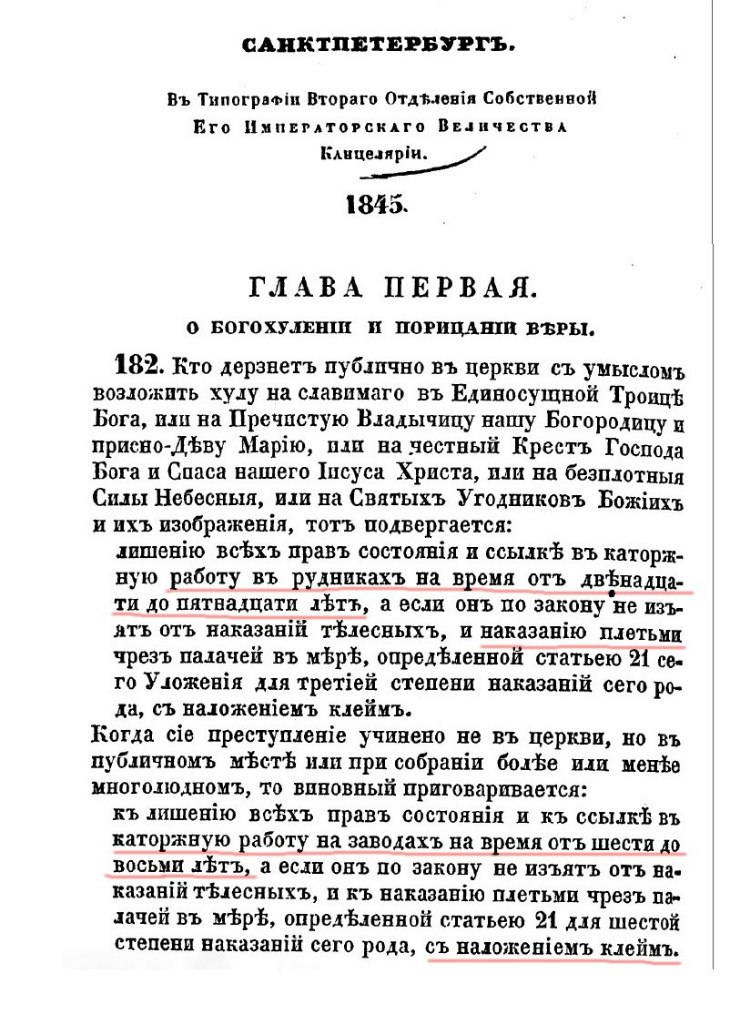 E13, какая сейчас обстановка и что было парусоточекназад: Статья 182: Умышленное публичное богохульство в церкви: Лишение всех прав и на рудники от 12 до 15 лет. Простолюдинам, в довесок, клеймо и 70-80 ударов плетью. Богохульство в публичном месте: лишение всех прав, от 6 до 8 лет каторги на заводах