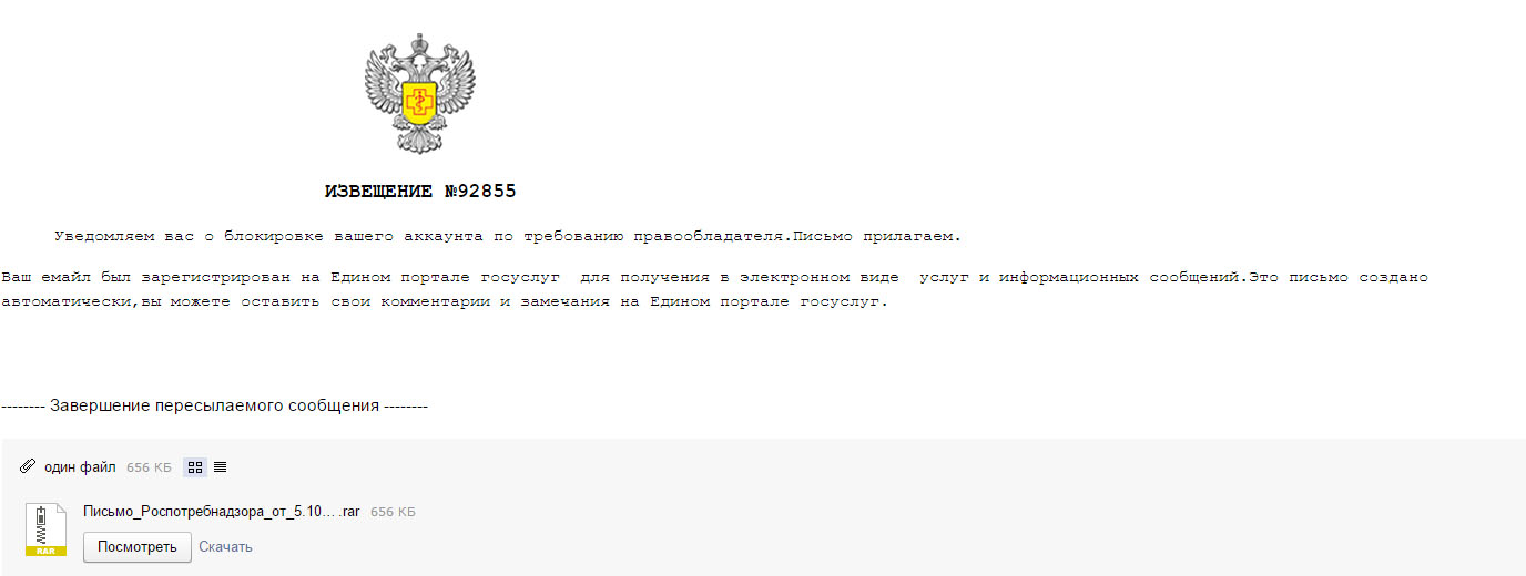 Вот сегодня знакомые присылают Общение по электронной почте. Я говорю о молодцы. Я предупреждал о таких письмах. Они да мы открывали его, но ничего ен происходит. Я такой. ААА ))) Полез рабираться пока не поздно. Быстро попросил бекап делать на флешку, отсоединять от сети и тд. Они нам работать надо, до конца дня не потерпит? Комп с базой на магазине складе стоит. Ну как вот убедить людей что пока не грянет ничего делать не будут)) Я к ним недавно ходил делал проверочку по их просьбе. Фирма не большая, но участились проверки у конкурентов, на предмет програмного обеспечения. Я проверил, вполне норм, лицензии на винду есть даже лишнии нашли, 1с ки (4 штуки разны) тоже с ключами работают, какие онлайн зареганы ну все норм (исключая некоторых чисто бюрократичеких нюансов и возможных трений от органов когда лицензия и ключ есть а доков на это и след простыл, хотя это ИП тут проще всё моё могу в работе использовать). Касперский стоял ключ кончился снесли навсякий случай, надо новую лицуху приобретать. К чему расказываю. Подключаюсь удаленно, пытаюсь запустить файл, ну раз уже запускали то. Он окрывается Адоб Ридером, думаю мож косяк какой вирус шифруется под что ехе с пдфом, а вот и нет, по какойто случайности в 7zip не стояла галочка открывать rar и система пыталсь открыть adobом. Надеюсь пронесло А про вирус этот пишут. Почитайте в инете. Атака с рассылкой идет последние несколько дней от Роспотребнадзора. Будьте аккуратны не факт, что антивирус поможет virustotal подозрение от левых антивирусов дает только 3 из 53, все монстры молчат и говрят что файл ОК, ну пока ок пока обнавятся сигнатуры и т.д. так что никакие покупки антивируса не панацея з.ы. свалилось письмо сейчас куплю на вашем сайте то то и просьба перейти по ссылке Грамотное письмо, явно не роботом составлено, действующий сайт и что продают, только дасада этот емайл уже не фигурирует на сайте, совсем другой для обратной связи используется. Ну понятно гдето засветился емайл как комерческой организации, типа можно подоить
