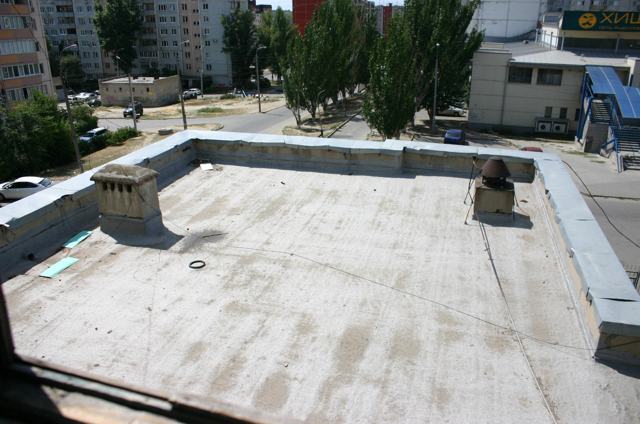 Не бесплатно, если альпинисты, ну а что делать? Котик там всю ночь сидел, и еще в жару просидит. Вот крыша, котик сейчас в трубе слева.
