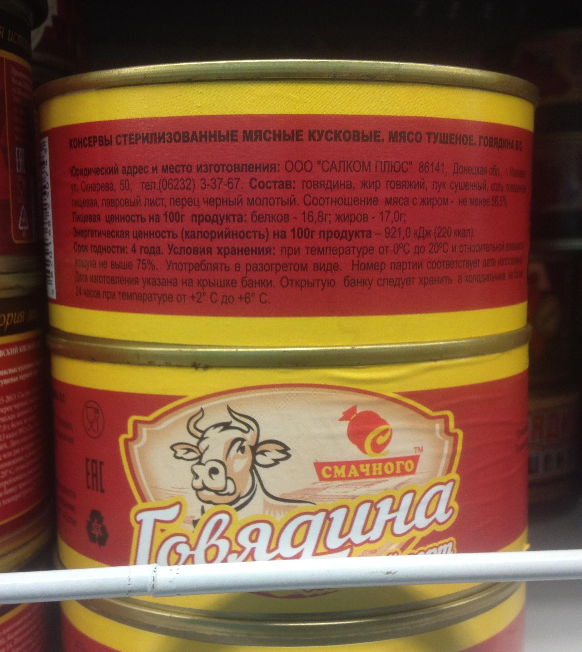 Блин, я еще в магазе подумал: " Какие нафик тушенки в Донецке? Там людям самим жратву камазами из агрессора возят." Но таки взял. Одну говяжью и одну свинячью. Говяжью вот затестил. Свинячью пока в сторонку отложил. Отныне продукция наших друзей-ДНРовцев запретна в моем доме. ---------- Сообщение добавлено 16.01.2016 18:11 ---------- У меня даже мысль возникла: наверное они из гумконвойного тушняка мясо выковыривают, а весь шмурдяк в тазы. Потом по банкам закатывают и в Магниты.