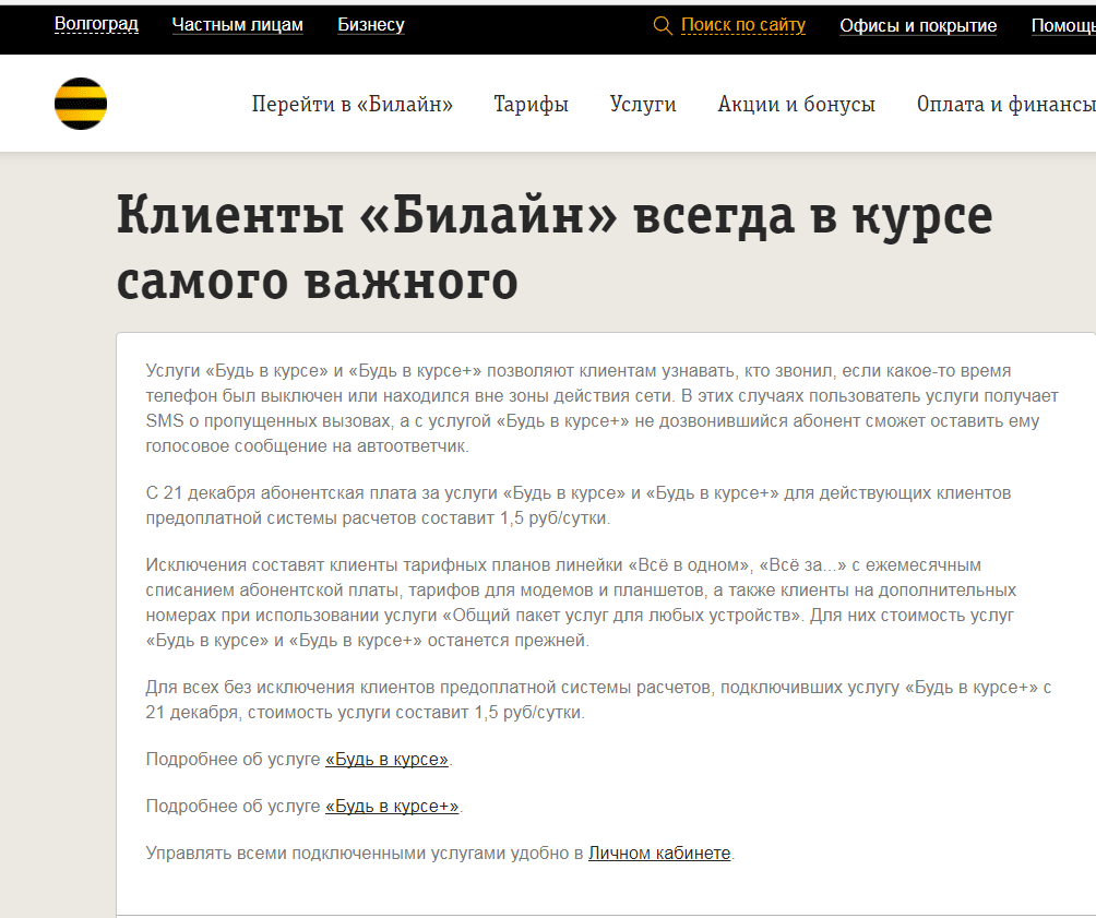 Клиенты «Билайн» всегда в курсе самого важного – Пресс-центр – Волгоград С 21 декабря абонентская плата за услуги «Будь в курсе» и «Будь в курсе+» для действующих клиентов предоплатной системы расчетов составит 1,5 руб/сутки. Исключения составят клиенты тарифных планов линейки «Всё в одном», «Всё за...» с ежемесячным списанием абонентской платы, тарифов для модемов и планшетов, а также клиенты на дополнительных номерах при использовании услуги «Общий пакет услуг для любых устройств». Для них стоимость услуг «Будь в курсе» и «Будь в курсе+» останется прежней. p.s. касается, походу, всех, кроме текущих активных тарифов Все...