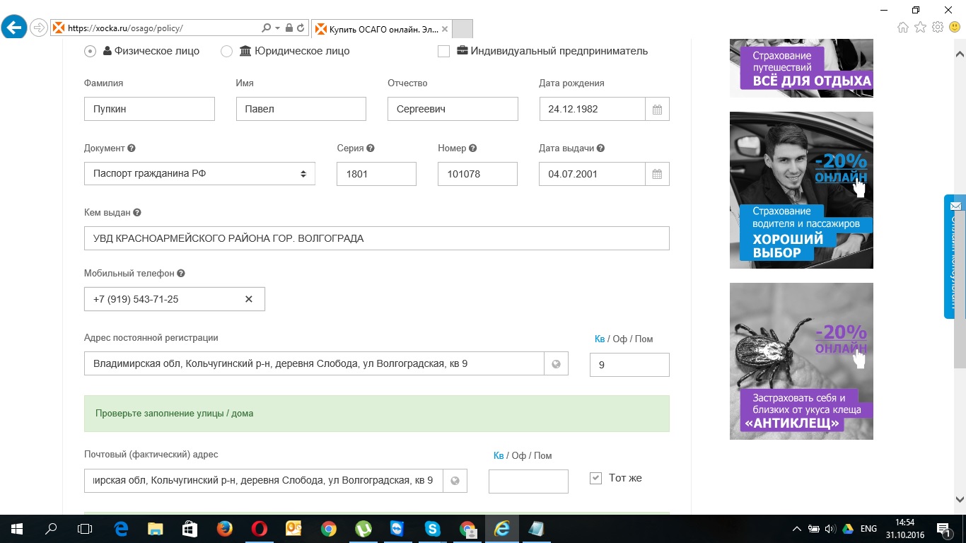 Сейчас оплатил свой, сразу проверяется. ---------- Сообщение добавлено 31.10.2016 11:09 ---------- Не из за IP. У меня дома бьется как Брянск, на работе как Волгоград и все оформляется. Там дело в информации из РСА как я понял, не всем дает застраховаться.