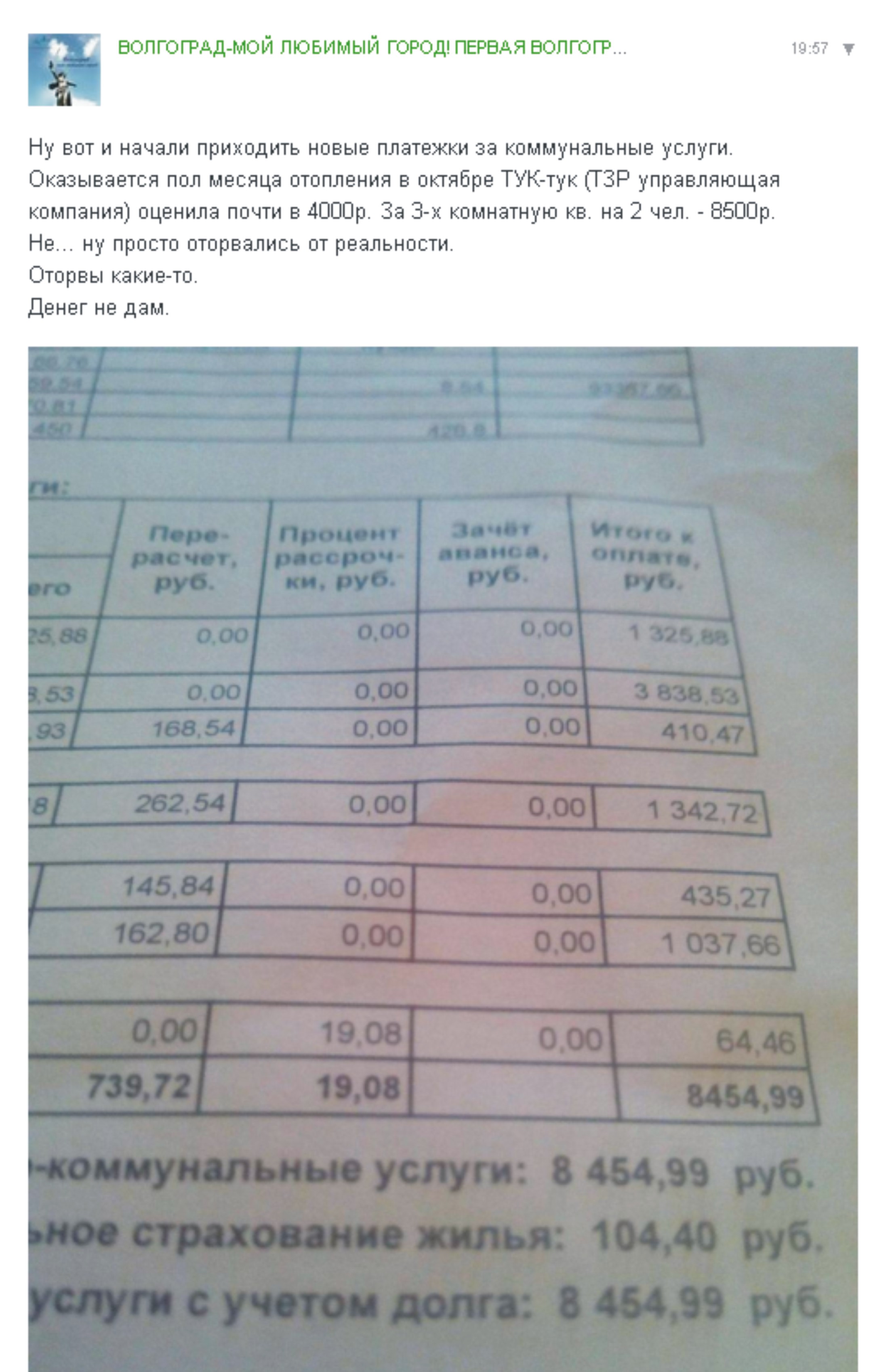 Начисляют с 1 октября по 30 октября. А вот по поводу перерасчета будем разбираться, не делали нам его Как я поняла, такое сильное увеличение тарифов коснулось в первую очередь домов с этажностью 1-4, построенных до 1999г. В элитке живем Можно обратиться в МФЦ за адресной помощью для тех, у кого сильно выросла плата за отопление, вот даже интересно сколько же она составит, эта помощь))) ---------- Сообщение добавлено 07.11.2015 20:22 ---------- Конечно, потрясающая логика) Что-то не готова я платить за коммуналку по 7600 в месяц было бы за что, весь отопительный сезон мы мерзнем