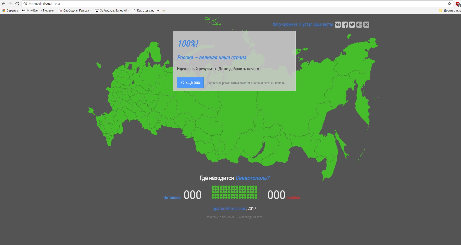 Тест на знание регионов РФ по контурной карте http://motovskikh.ru/russia 87% зону Урала и южнее почти не знаю
