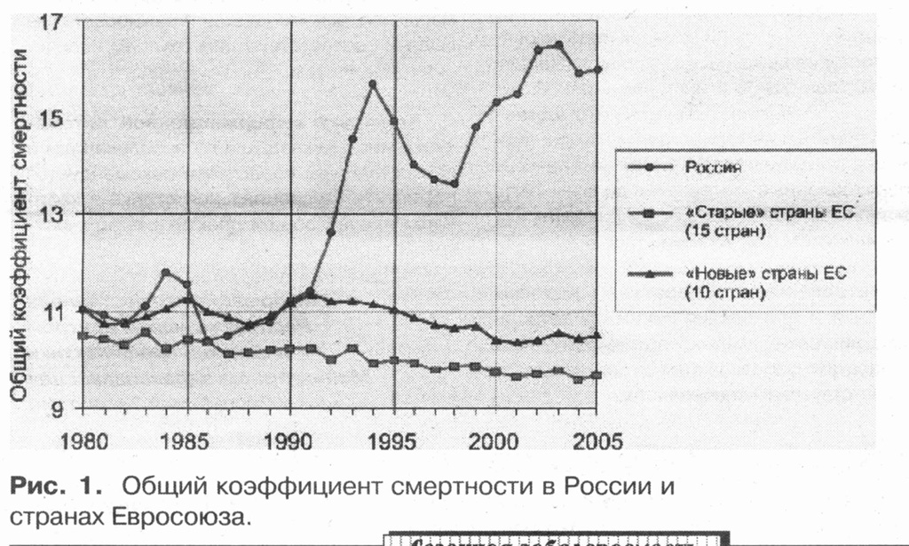 Этот пик появился а участке на котором была тенденция резкого увеличения смертности, и он начался в 1998 году. А вообще. если брать более обшие тенденции то началом станет 91 год. Будет резкий рост. свойственный войнам и эпидемиям. А потом он замедляется и начинается медленное падение.