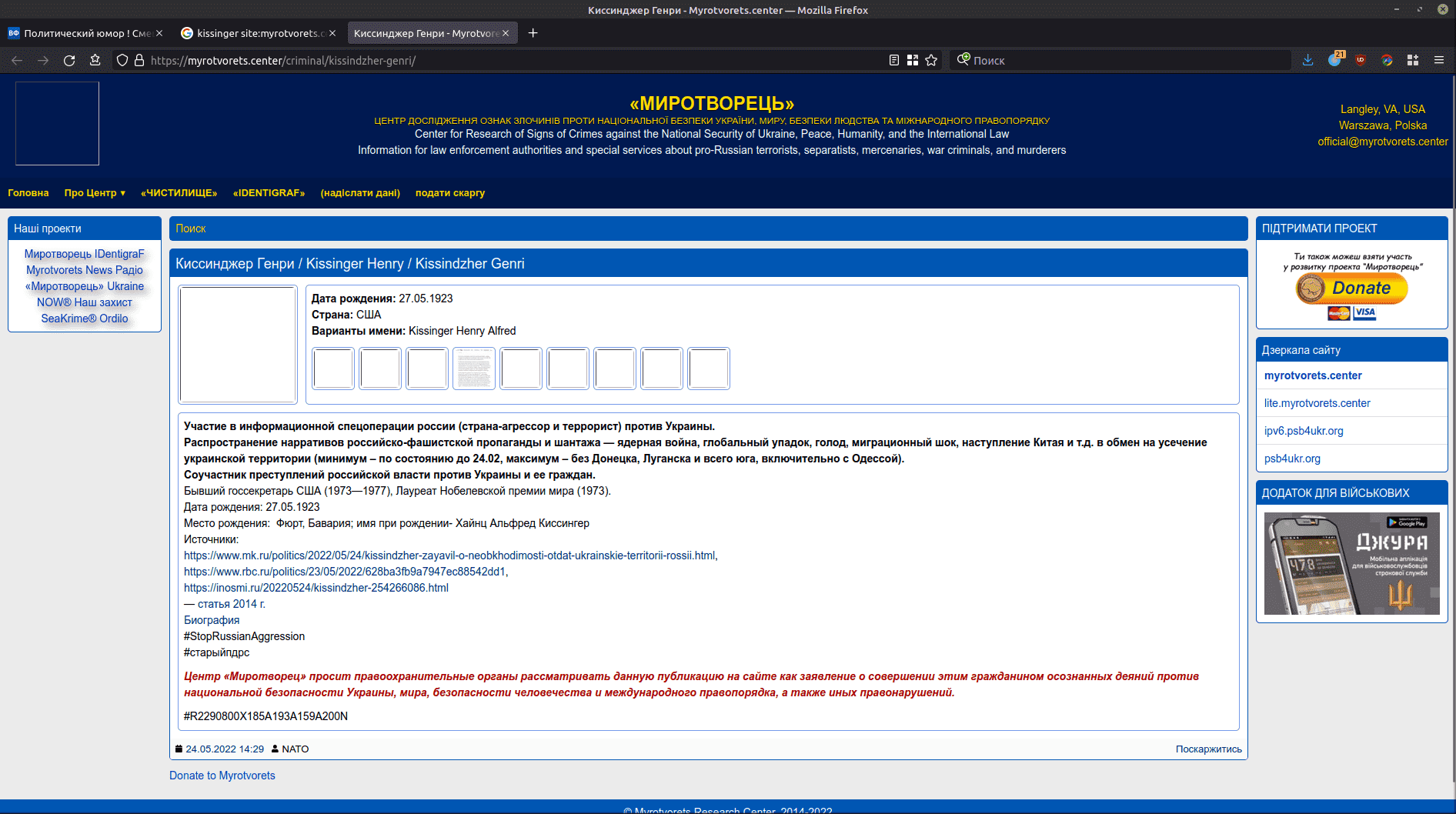 Демаскирующие перчатки, да и рюкзачок с броником маскировке не способствуют. *** Бгг, сайт Миротворець внес Киссинджера в свои списки. Пруф: https://myrotvorets.center/criminal/kissindzher-genri/ (доступ через впн, разумеется). У укропов совсем уже башню сносит, на святое покушаются. ***