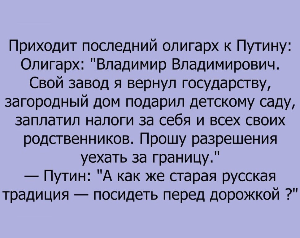 Путин жалуется Медведеву: - Сойти с ума можно с этими часовыми поясами! Звоню во Владивосток, чтобы поздравить с Днем народного единства, а они мне говорят: «Так это у нас вчера было». Звоню Трампу поздравить его с избранием в президенты, а он мне говорит: «Но у нас же выборы только завтра»! ---------- Сообщение добавлено 12.11.2016 08:49 ---------- Кэмерон: «Brexit порадует Путина». Обама: «Трамп порадует Путина». Оказалось, люди всего мира желают радовать Путина.