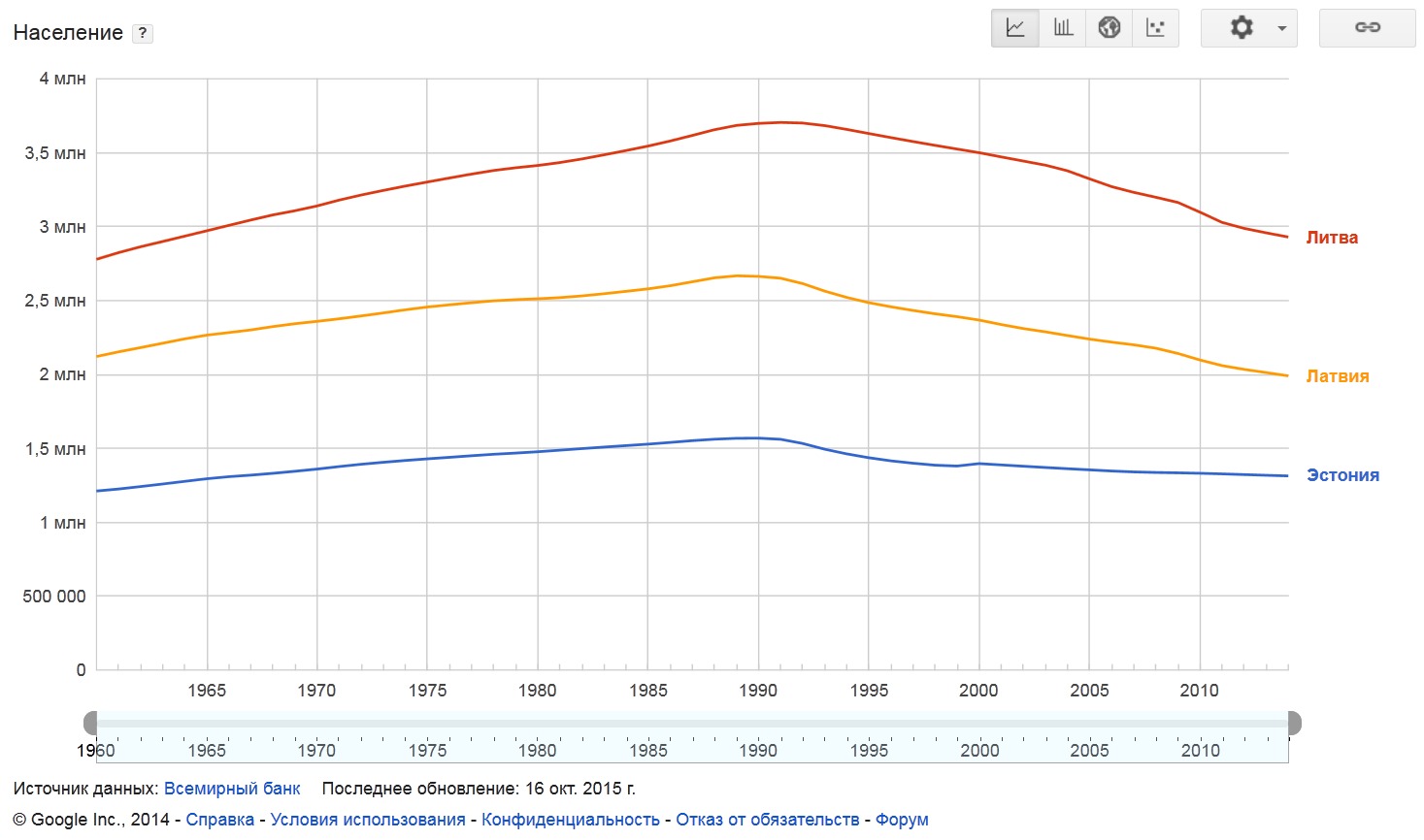 Не поделишься ли соображениями, откедова в их казну монета низвергается мощным водопадом? Заодно, раз уж мы про стабильность, выскажи предположения, почему их численность населения до развала СССР стабильно росла, а после развала стабильно снижается. Рукопожатное и демократичное сцылко (от самих Гугла и Всемирного Банка!!!) на динамику численности населения: https://www.google.ru/publicdata/ex...pop_totl&idim=country:LTU:LVA:EST&hl=ru&dl=ru Для тех, кому лень ходить по ссылке, прилагаю скриншот. Ну делись тогда и соображениями, что такое ООН, где она берёт эгиды, и как, и что ими накрывает, и где берёт фреон, чтобы замораживать процессы. Короче, интересует механика действия, как ты себе её представляешь. Так всё же на шее сидят или разруха? Сразу то и другое ведь быть не может? Или может? Чеченцев упрекали, что они, мол, на шее сидят, так там хоть понятно, куда деньги делись. А в Абхазии куды ж триллиарды закопали? Я был там с годик назад, но почему-то не припомню, чтобы казалось, что деньги там есть хотя бы какие-то: нищета галимая, только портретов Фиделя Кастро не хватает. А, то есть, отбирать назад бывшие свои земли - это пятиться? Какой интересный лингвистический изыск. Абхазия, ДНР/ЛНР, Крым - это всё страна пятится. Отступает, значит. Теряет территории.