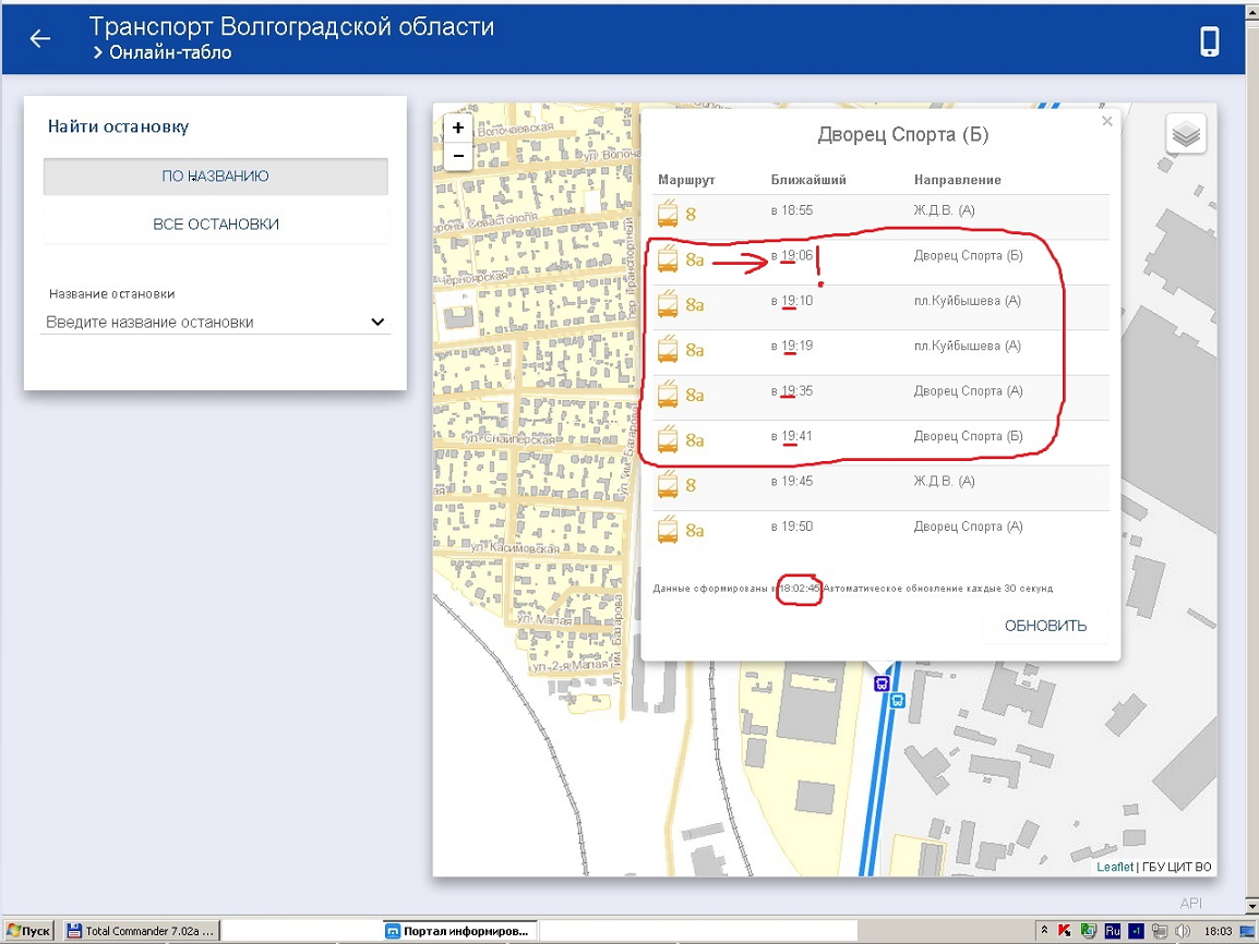 Итак, 9 марта, время 18:03 и вот что мы имеем (см. вложение). При этом троллейбус 8А пришел на "Дворец спорта" в 18:05, потому как в 18:06 я уже наблюдал его движение в сторону "Мамаева кургана", а, например, согласно услуге "SMS-транспорт" следующий троллейбус данного маршрута должен был подойти на "Дворец спорта" вообще в 18:24, а затем в 18:49, что опять-таки никак не совпадает с тем, что изображено на картинке. Продолжаю наблюдать за порталом.