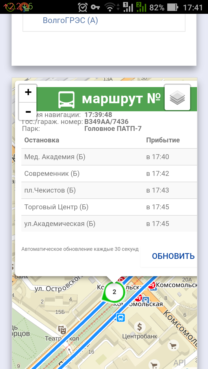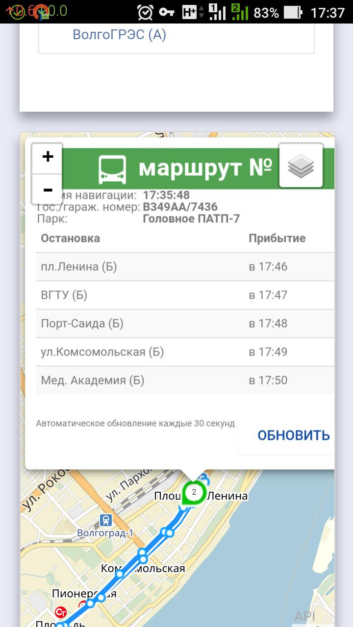 Интересно, разработчики этого чуда его поддерживают, или как? Постоянно наблюдаю сбои и резкие изменения данных. Вот, сегодня вечером: Время 17:37, стою на остановке ВГТУ(Б), прогноз прибытия автобуса №7436 через 10 минут. В реальности он появляется через минуту, где-то 17:38. Второй скриншот сделал несколько позже, пока уселся, пока заплатил, то, да се. 17:41, еще 6 минут до прибытия на ВГТУ, а мы уже Аллею проехали (на картинке отметка всегда отстает). Тот же самый 7436. Формуляр перепрыгнул на 10 минут вперед.