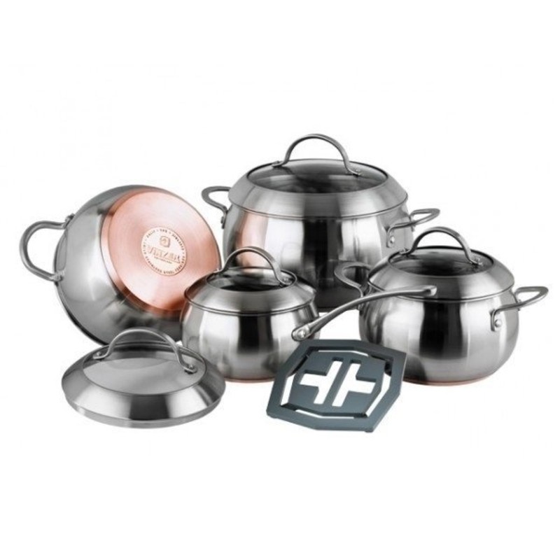 Посуды много разной, но в основном пользуюсь стальным ковшом с толстым дном Thomas Rosental, эмалированной турецкой кастрюлей, советской сковородкой с высокими бортами, пароваркой, СВЧ печкой(для разогрева). Были раньше тефлоновые сковородки, все в утиль пошли, советская - самая удобная (и для блинов, и для картошки, и для всего прочего). Запекаю в электрической духовке в стеклянных формах.