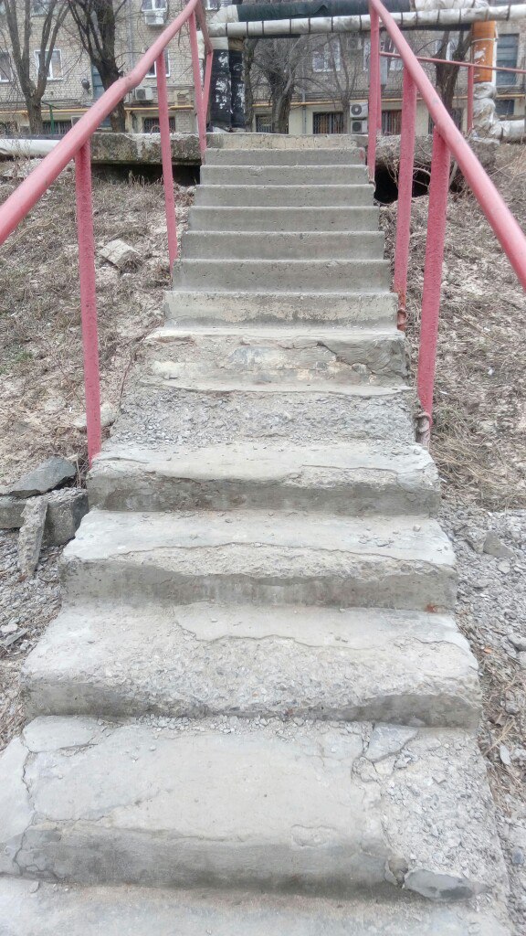 У нас лестница еще лучше) Во дворе были малые формы, но в апреле 16 года концессии водоснабжения все, разрыли формы убрали, восстанавливать отказались, УК претензий к ним не имеет, восстанавливать площадку будет своими силами в мае (т.е. через 13 месяцев после проведения работ) P.S. Жилкомсервис, привет)