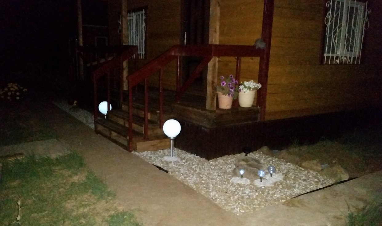 Ольга М., По камням я вообще сделал хитрее. По объявлению купил ГАЗон мелкого щебня-гальки и высыпал в нужных местах на эту ткань. А сверху мраморной крошкой посыпал. Газон обошелся в 7 тысяч. Мешок крошки 800. Фото нашел только такое. Вообще фоткал фонарики. Поищу еще.