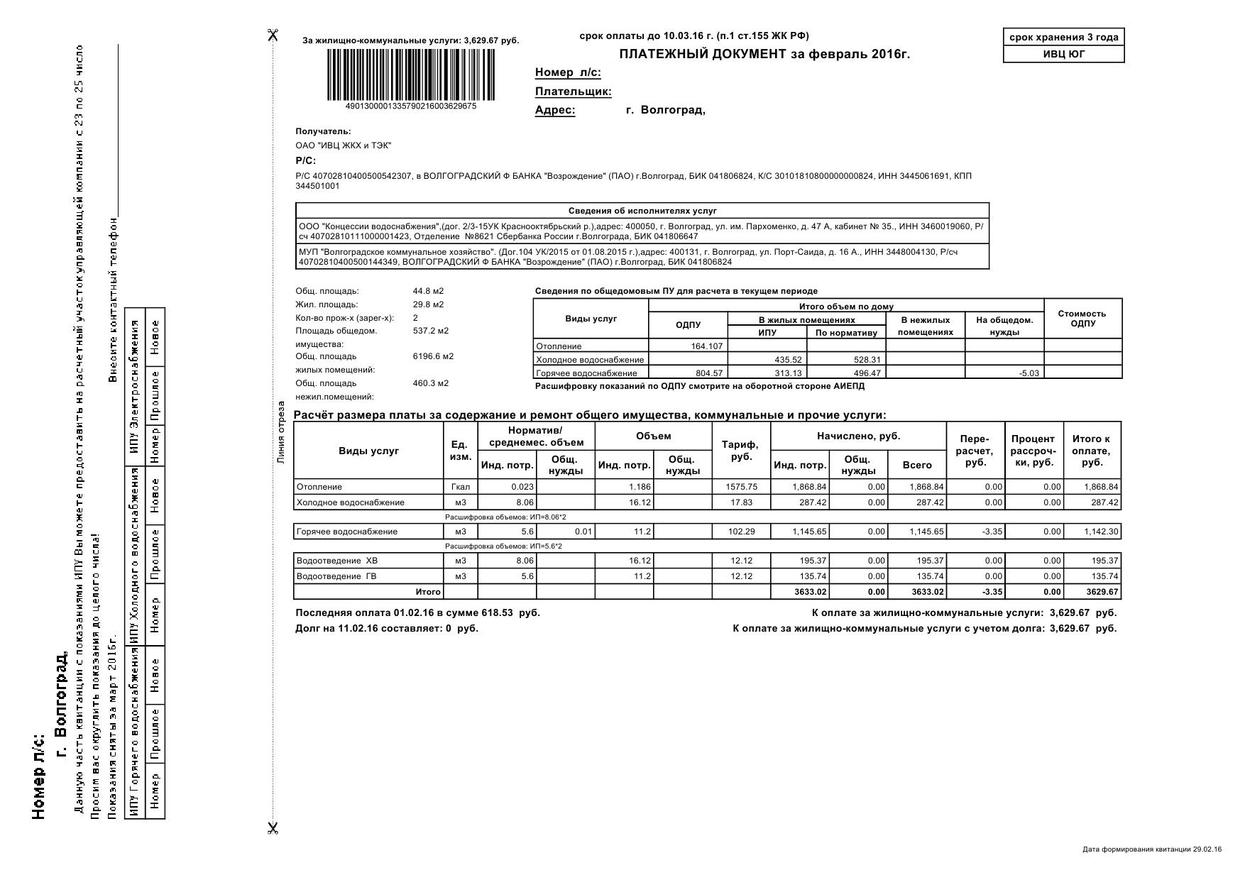 Вы внимательно читали моё сообщение? Теперь по поводу " не мутите воду". Я по жизни не люблю пустых слов. Порядок предоставления коммунальных услуг собственникам и пользователям помещений в многоквартирных домах и жилых домах регламентируется постановлением Правительства РФ от 06.05.2011 № 354 (далее – Правила). Потребители с централизованным теплоснабжением оплачивают потребленную тепловую энергию на основании приборов учета или по нормативу. В соответствии с Правилами, в многоквартирном доме, который оборудован коллективным (общедомовым) прибором учета тепловой энергии и в котором не все жилые или нежилые помещения оборудованы индивидуальными и (или) общими (квартирными) приборами учета (распределителями) тепловой энергии, размер платы за коммунальную услугу по отоплению в жилом помещении (Pi) определяется исходя из показаний коллективного (общедомового) прибора учета тепловой энергии: Pi= Vд * Si / Sоб * Тт где: Vд — объем (количество) потребленной за расчетный период тепловой энергии, определенный по показаниям коллективного (общедомового) прибора учета тепловой энергии. Si — общая площадь i-го жилого или нежилого помещения ; Sоб — общая площадь всех жилых и нежилых помещений многоквартирного дома; Тт— тариф на тепловую энергию Я прикрепляю 2 файла:1. платежка за январь 2016г от управляющей организации и 2. платежка уже от ИВЦ " ЖКХ и ТЭК". Обратите внимание на начисление отопления с учетом приведенной формулы. И станет ясно что я имею в виду. Нежилое помещение арендует наша управляющая организация у недвижимого имущества муниципальной имущественной казны Волгограда. А что могло произойти при переносе платежки из управляющей организации в РСО МУП ВКХ? Может быть вышло какое-нибудь новое Постановление Правительства РФ? Просветите. Кто позволил нарушать закон? Вот о чем я предупредил жителей моего города Волгограда.