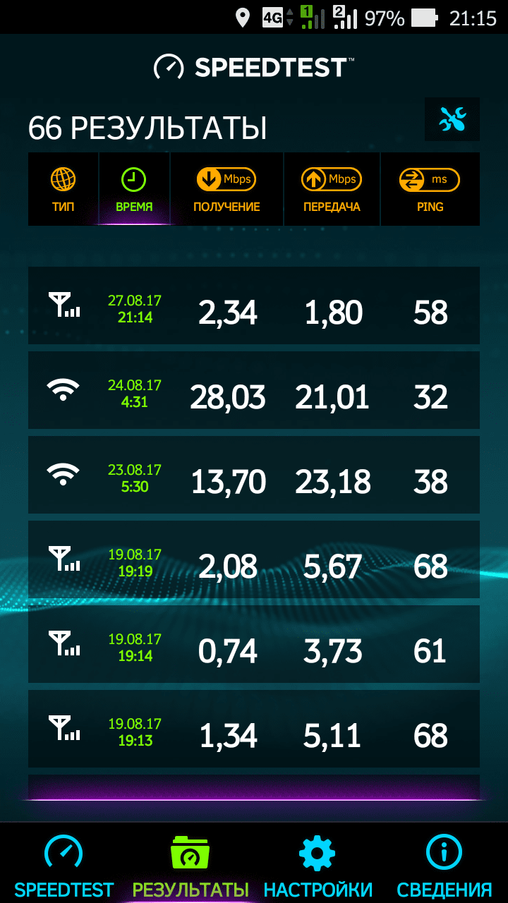 Где иконка вайфая — это мегафон с роутера. Где иконка мобильной сети — это непосредственно на смартфоне в том же месте. Место — частный сектор Петрова. Так-то ладно, 800 МГц чудесных скоростей показать не может, но явный перекос в сторону исходящей скорости как бы намекает нам на слишком тощий канал для текущего количества желающих. Оверселлинг во всей красе. Для старта вполне терпимо, народ резко накинулся кочадь, посмотрим, как дальше.