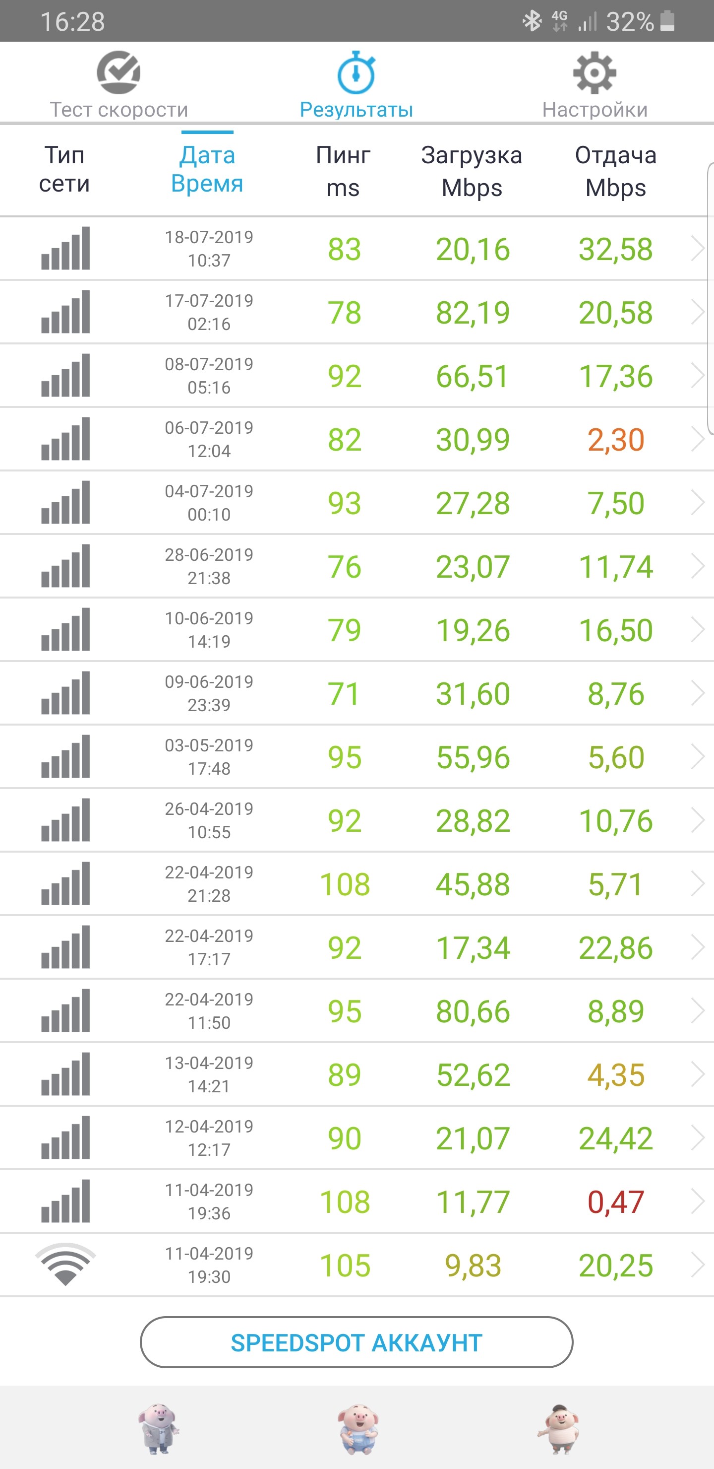 Периодически тыкаю в спидтест на телефоне. В моей местности последний месяц-два очень прилично шурует, порядка 30-50 на прием, и очень стабильно в процессе измерения — стрелка почти не шевелится. В часы пик бывает похуже, но все равно выше 10 мбит, а это HD на ютубе без затыков.