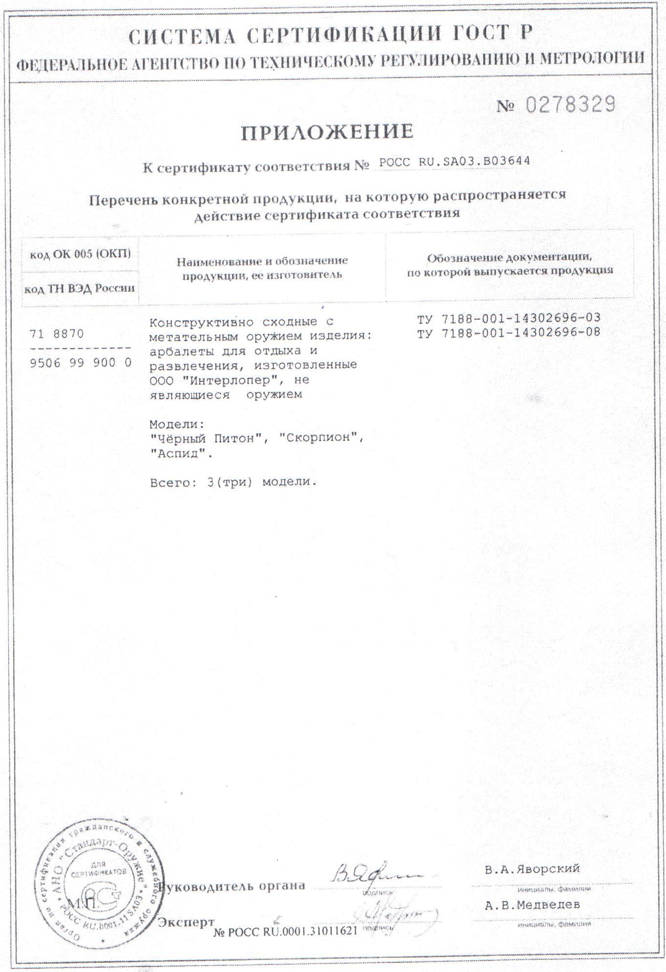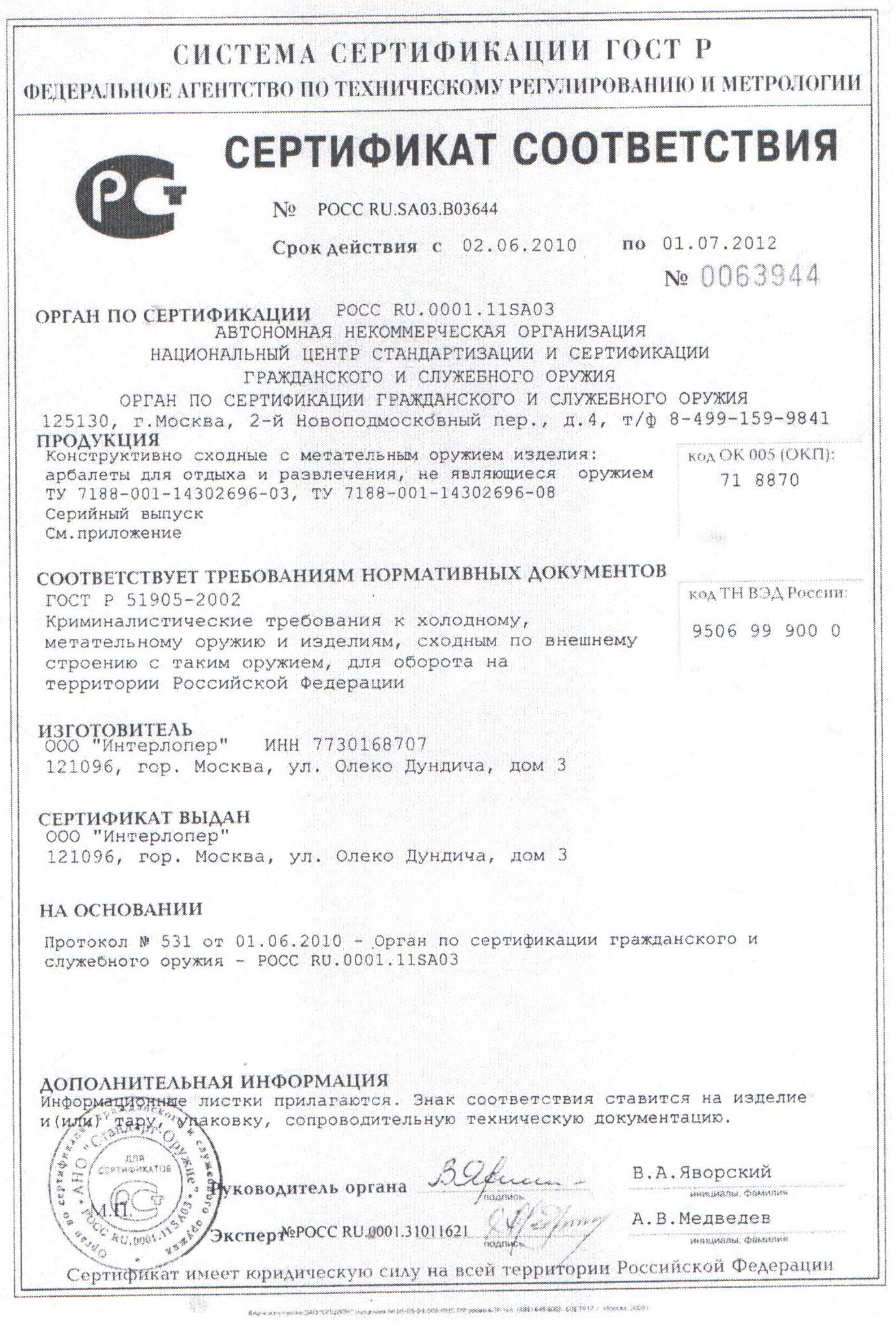 В каком законе это прописано? Я всегда думал что При транспортировании арбалетов с натяжением плеч до 43 кгс рекомендуется иметь при себе сертификат, подтверждающий, что данный вид оружия не является летальным и может использоваться исключительно в развлекательных целях. Подобный сертификат должен входить в комплект при продаже. Транспортировка арбалетов с натяжением плеч от 43 до 135 кгс должна производиться в разобранном виде и с обязательным наличием лицензии. Источник: http://bukva-zakona.com/grazhdanskoe-pravo/nuzhna-li-litsenziya-na-arbalet Bukva-zakona.com ©
