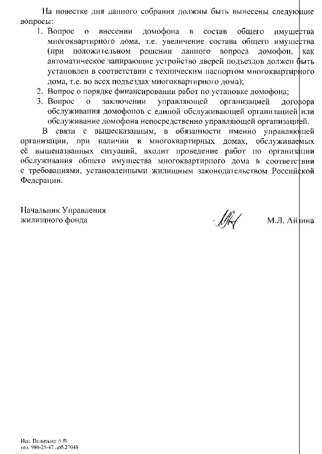 Письмо - полный бред! 1. Внесение абонентской платы будет являться моментом заключения договора. Оплатил квитанцию = заключил договор. 2. Собственники одного подъезда (если дом многоподъездный) не могут принять решение по условиям содержания общего имущества. Решение по содержанию домофона, если это общедомовое имущество, может принять только ОСС. 3. А уж если решение приняло ОСС, а какой-то из собственников не принимал участия в собрании, то, согласно ЖК РФ, решение ОСС является обязательным для всех и каждого собственника. В этом случае оплата квитанции - это обязанность, но не предложение. "Решение жильцов подъезда" Жесть! Ну, и, vrio, прав власть имущим похрен на домофонный беспредел. Всё общедомовое имущество, включая домофон, ОБЯЗАНА обслуживать УК.