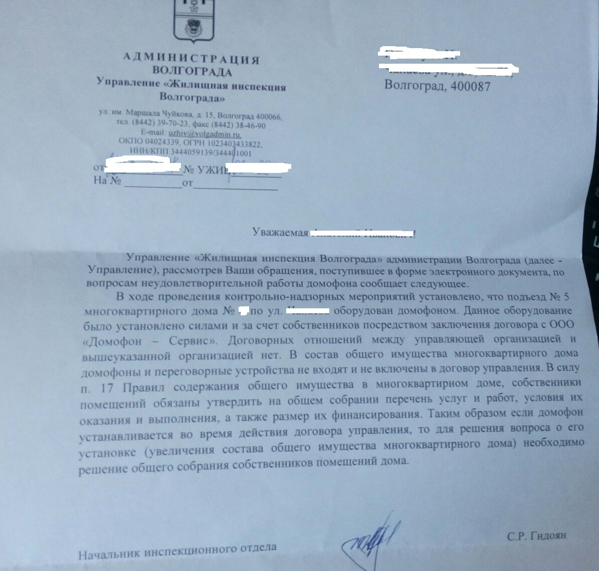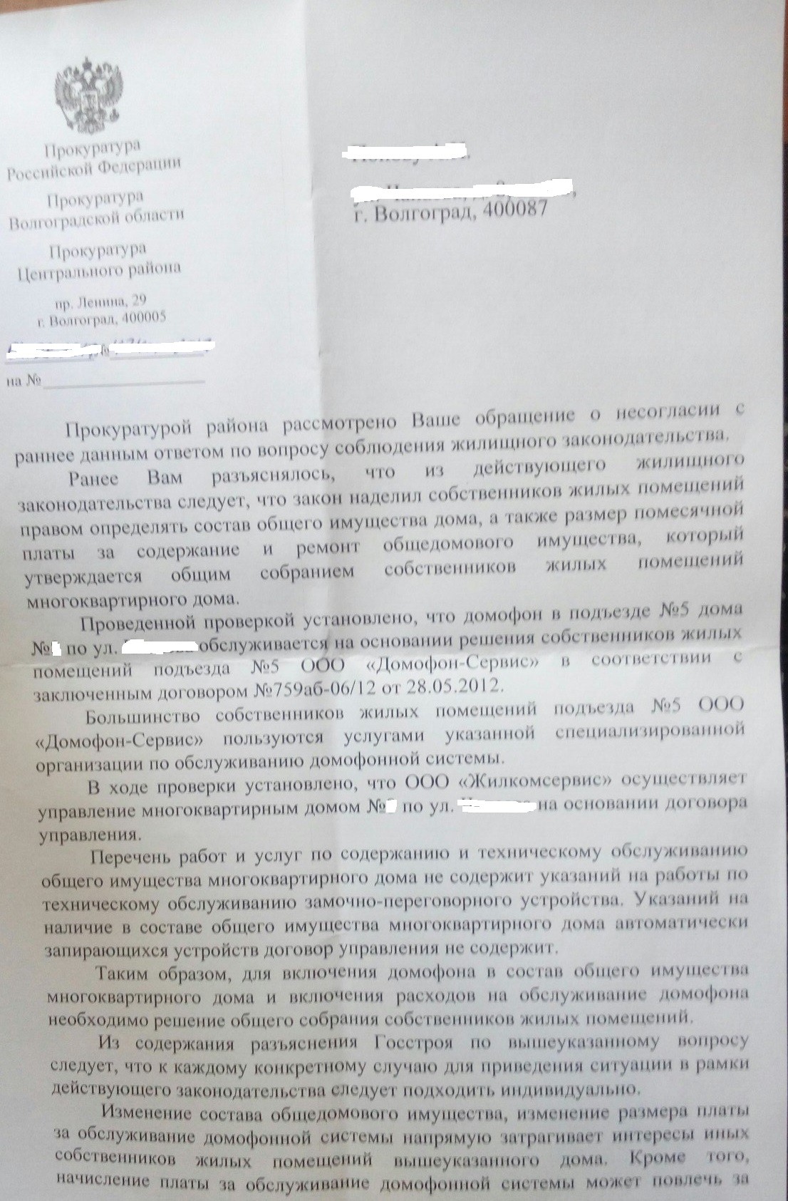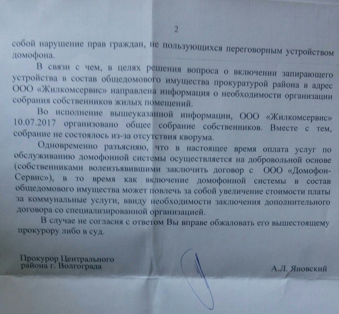 Подниму тему. Как появляется время - пишу по данному вопросу в различные органы. Последние ответы прилагаю. К заявлениям прикреплял ответы и из Минстроя. Что еще можно добавить? Интересен один факт, хотя даже два: 1) ОСС нужно, если домофон был установлен при ныне действущей УК. У нас договор с УК заключен в 2012 году, а домофон установлен в 2007. То есть УК должна была при заключении договора управления включить домофон в общую собственность. НО данный факт прокуратурой оставлен без комментария. 2) в 2014 г УК ремонтировала нам домофон - остался акт о выполненных работах на их бланке с подписями. То есть в 14 году они не отказывались от ремонта.