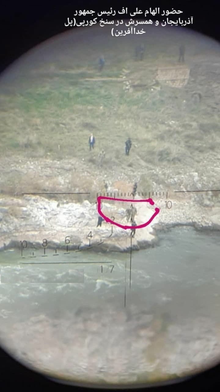 Любопытно. "Иранские пограничники наблюдают за вчерашним визитом президента Азербайджана Ильхама Алиева и его жены на перешедшие под контроль азербайджанских войск территории Нагорного Карабаха (район Худаферинские мосты) через оптический прицел ПСО-1, устанавливаемый на снайперскую винтовку Драгунова."