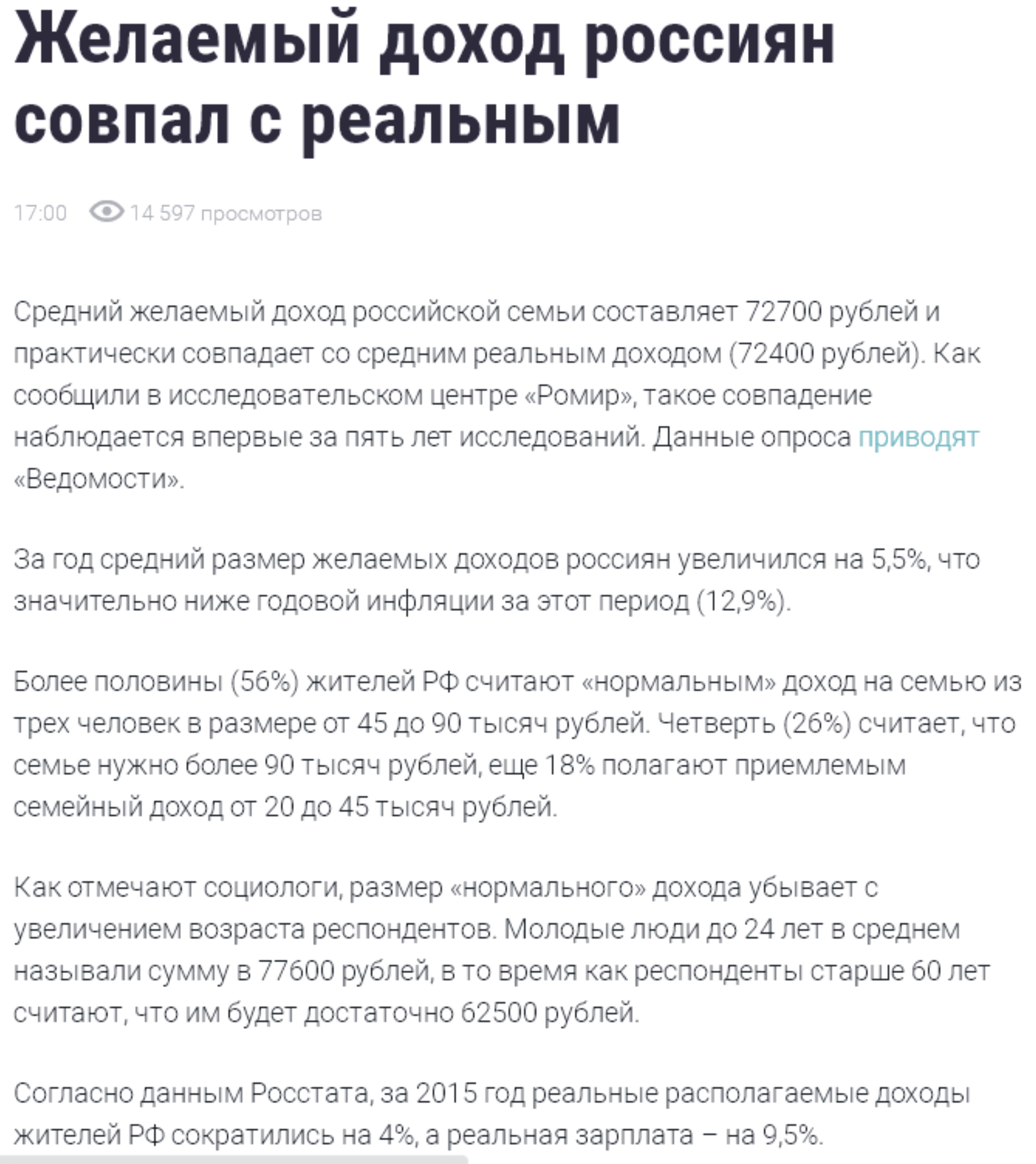 Желаемый доход россиян совпал с реальным. У всех же так ? Такое совпадение наблюдается впервые за пять лет исследований .