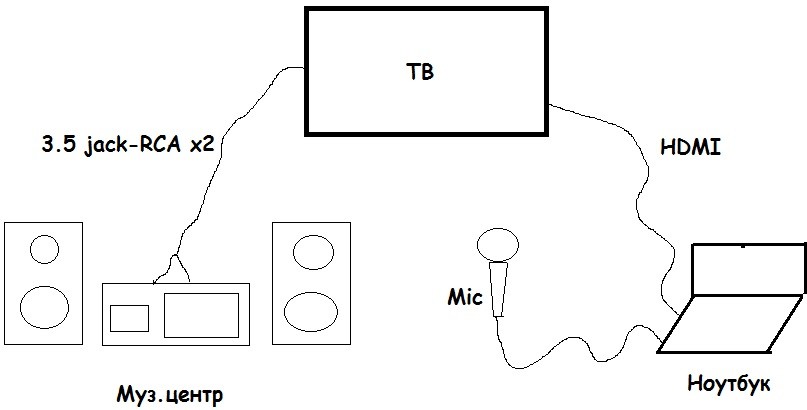 Караоке в домашних условиях Доброго времени суток уважаемые ФОРУМЧАНЕ. Требуется помощь понимающих людей. На днях жена попросила купить ей микрофон для того чтобы петь дома караоке. Купил. Изначально думал что все просто будет но как оказалось не так все просто. Суть вопроса в следующем: у нас есть ноутбук который через HDMI шнур подключен к телевизору, в ноутбук соответственно подключен микрофон. Телевизор в свою очередь звук выводит через музыкальный центр который подключен через AUX (3,5 х 2 RCA). Все как бы хорошо. Звук из микрофона есть из плеера есть. Можно включить минус и петь. Проблема в том что без обработки голоса в реальном времени получается все печально и не вкусно. И тут начинаются проблемы. Нашел в инете и установил "spinaudio.asio.fx.processor.se." Звук с микрофона обрабатывается, много разных пресетов, супер., НО теперь ASIO на выход дает только микрофон. откуда мне брать минус? Задумка такая, я хочу чтобы я мог открыть либо минус, либо видео на YouTube, и петь в микрофон. При этом из колонок должен быть слышен минус и обработанный spinaudio голос. Подскажите пож-та что я могу сделать, и что я делаю не правильно, дайте совет что можно придумать из такого набора техники. Возможно необходимо поменять программное обеспечение. Заранее спасибо. P/S - в приложении схема подключения.